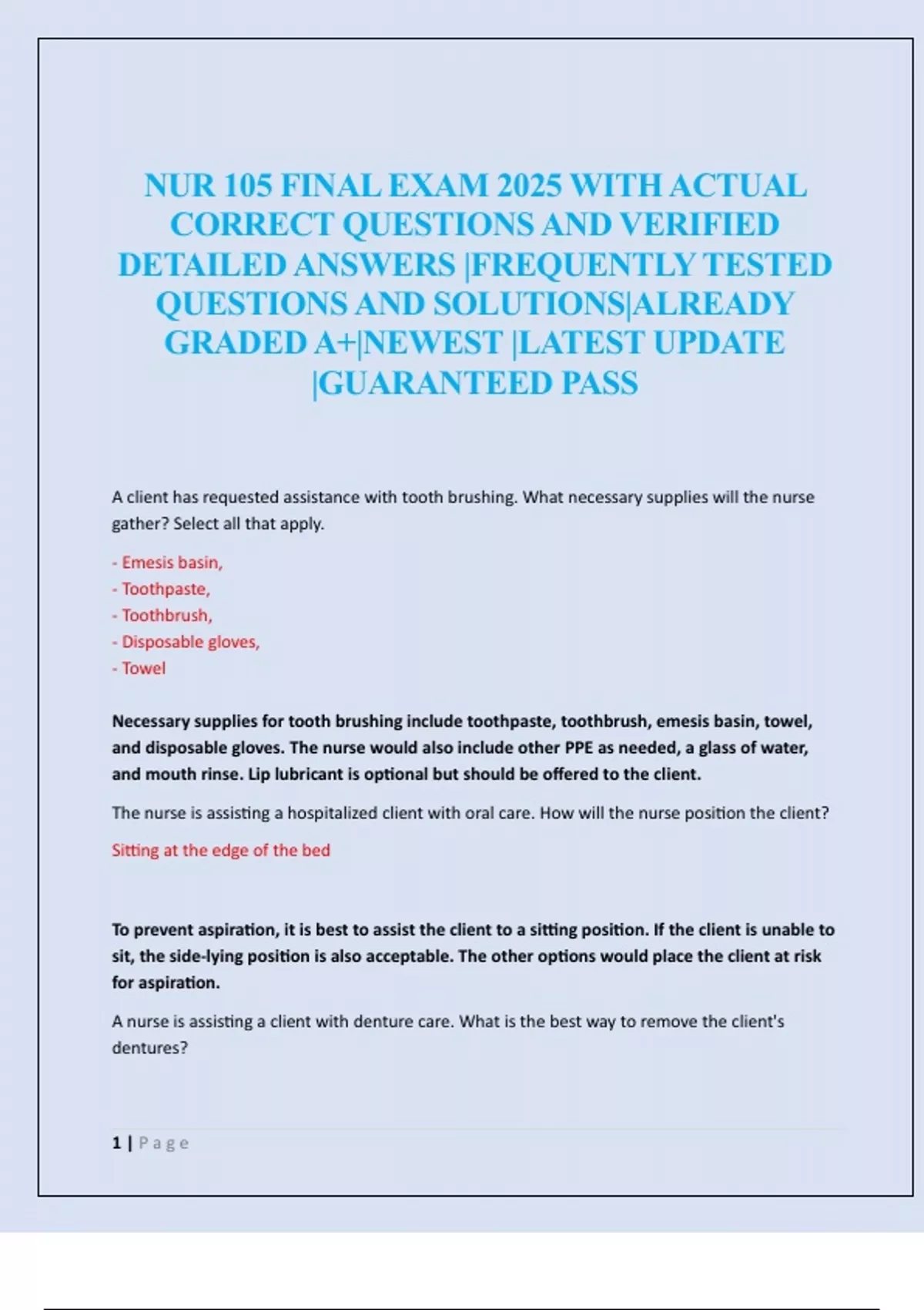 lower dentures. A toothbrush and paste, not sterile gauze, should be used to clean gums and