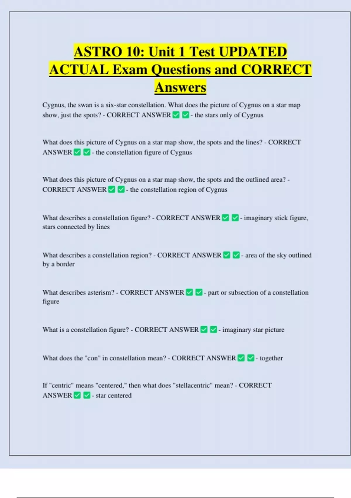 ASTRO 10: Unit 1 Test UPDATED ACTUAL Exam Questions and CORRECT Answers Cygnus, the swan is a six-star constellation. What does the picture of Cygnus on a star map show, just the spots? - CORRECT ANSWER - the stars only of Cygnus What does this picture of Cygnus on a star map show, the spots and the lines? - CORRECT ANSWER - the constellation figure of Cygnus What does this picture of Cygnus on a star map show, the spots and the outlined area? - CORRECT ANSWER - the constellation region of Cygnus