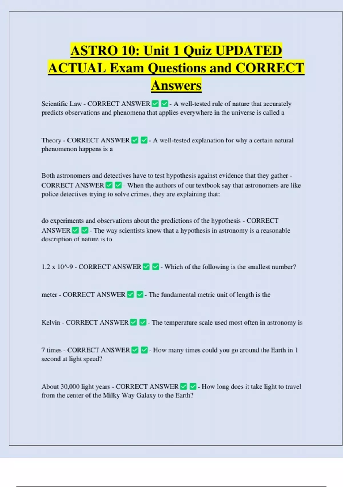 ASTRO 10: Unit 1 Quiz UPDATED ACTUAL Exam Questions and CORRECT Answers Scientific Law - CORRECT ANSWER - A well-tested rule of nature that accurately predicts observations and phenomena that applies everywhere in the universe is called a Theory - CORRECT ANSWER phenomenon happens is a - A well-tested explanation for why a certain natural Both astronomers and detectives have to test hypothesis against evidence that they gather - CORRECT ANSWER - When the authors of our textbook say that astronomers are like police detectives trying to solve crimes, they are explaining that