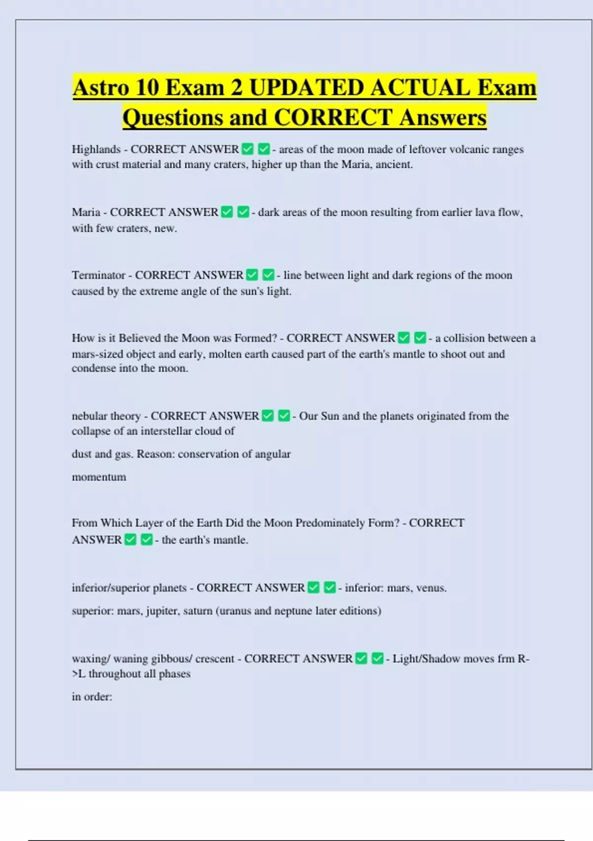 Astro 10 Exam 2 UPDATED ACTUAL Exam Questions and CORRECT Answers Highlands - CORRECT ANSWER - areas of the moon made of leftover volcanic ranges with crust material and many craters, higher up than the Maria, ancient. Maria - CORRECT ANSWER with few craters, new. Terminator - CORRECT ANSWER - dark areas of the moon resulting from earlier lava flow, - line between light and dark regions of the moon caused by the extreme angle of the sun's light. How is it Believed the Moon was Formed? - CORRECT ANSWER - a collision between a mars-sized object and early, molten earth caused part of the earth's mantle to shoot out an
