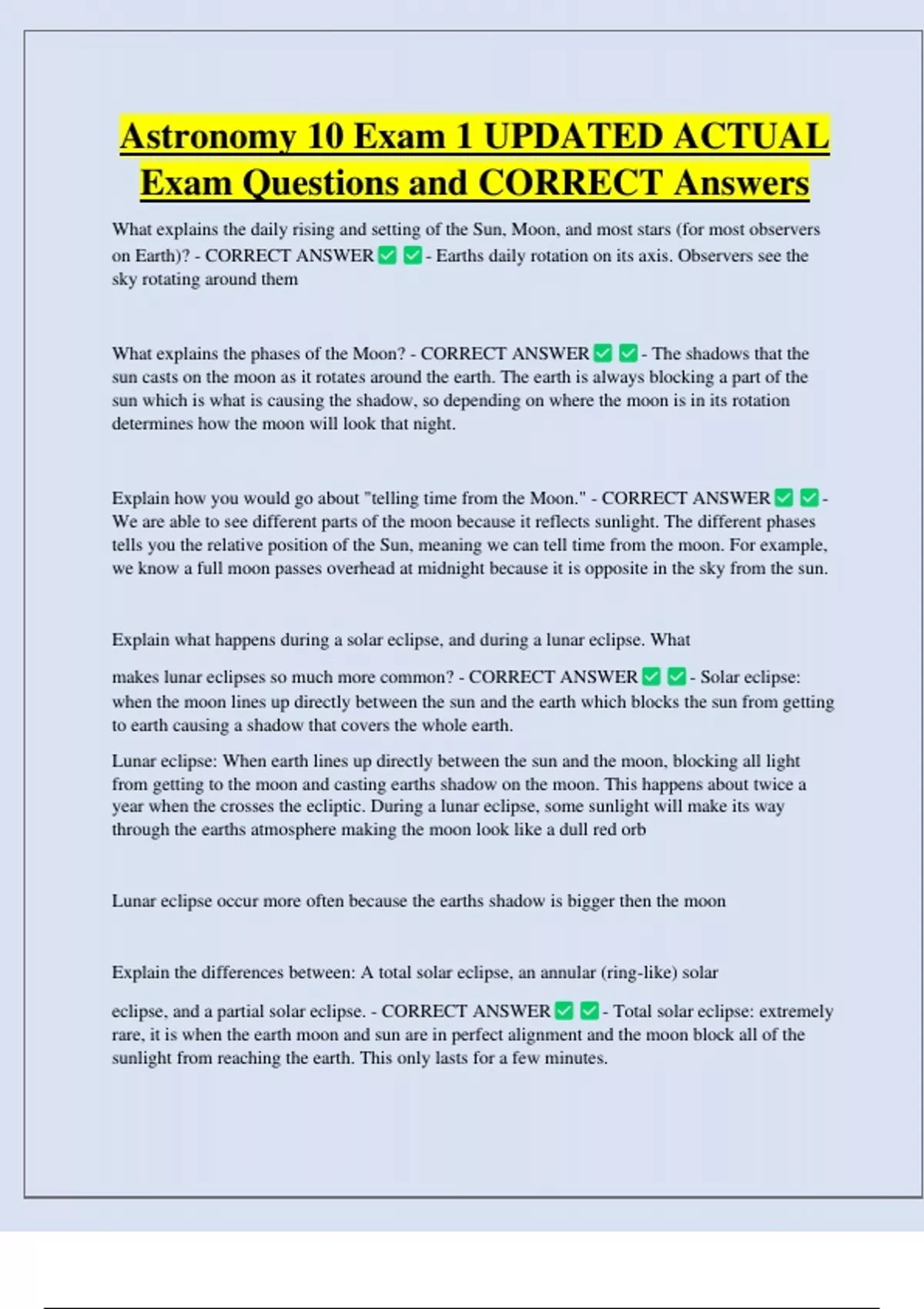 Astronomy 10 Exam 1 UPDATED ACTUAL Exam Questions and CORRECT Answers What explains the daily rising and setting of the Sun, Moon, and most stars (for most observers on Earth)? - CORRECT ANSWER - Earths daily rotation on its axis. Observers see the sky rotating around them What explains the phases of the Moon? - CORRECT ANSWER - The shadows that the sun casts on the moon as it rotates around the earth. The earth is always blocking a part of the sun which is what is causing the shadow, so depending on where the moon is in its rotation determines how the moon will look that night