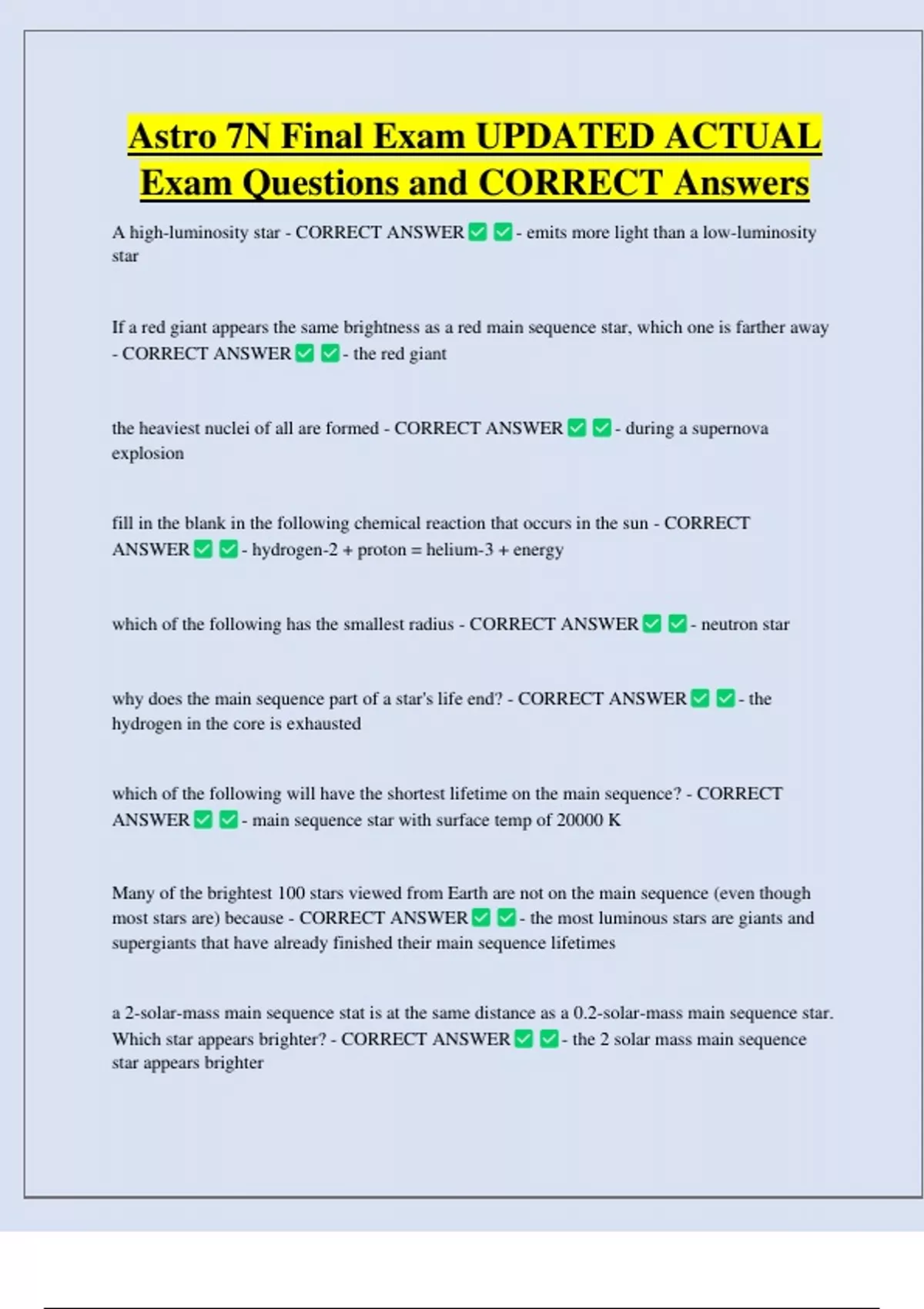 Astro 7N Final Exam UPDATED ACTUAL Exam Questions and CORRECT Answers A high-luminosity star - CORRECT ANSWER star - emits more light than a low-luminosity If a red giant appears the same brightness as a red main sequence star, which one is farther away - CORRECT ANSWER - the red giant the heaviest nuclei of all are formed - CORRECT ANSWER explosion - during a supernova