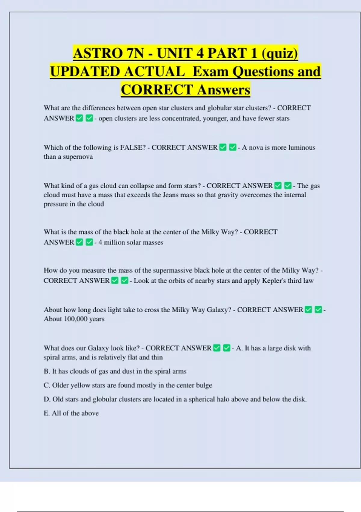 ASTRO 7N - UNIT 4 PART 1 (quiz) UPDATED ACTUAL Exam Questions and CORRECT Answers What are the differences between open star clusters and globular star clusters? - CORRECT ANSWER - open clusters are less concentrated, younger, and have fewer stars Which of the following is FALSE? - CORRECT ANSWER than a supernova - A nova is more luminous What kind of a gas cloud can collapse and form stars? - CORRECT ANSWER - The gas cloud must have a mass that exceeds the Jeans mass so that gravity overcomes the internal