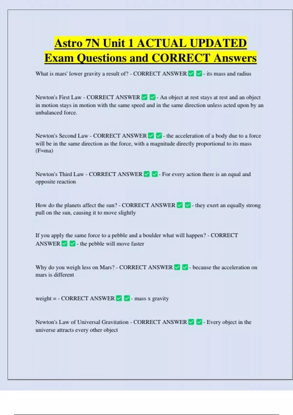 Astro 7N Unit 1 ACTUAL UPDATED Exam Questions and CORRECT Answers What is mars' lower gravity a result of? - CORRECT ANSWER Newton's First Law - CORRECT ANSWER - its mass and radius - An object at rest stays at rest and an object in motion stays in motion with the same speed and in the same direction unless acted upon by an unbalanced force. Newton's Second Law - CORRECT ANSWER - the acceleration of a body due to a force will be in the same direction as the force, with a magnitude directly proportional to its mass