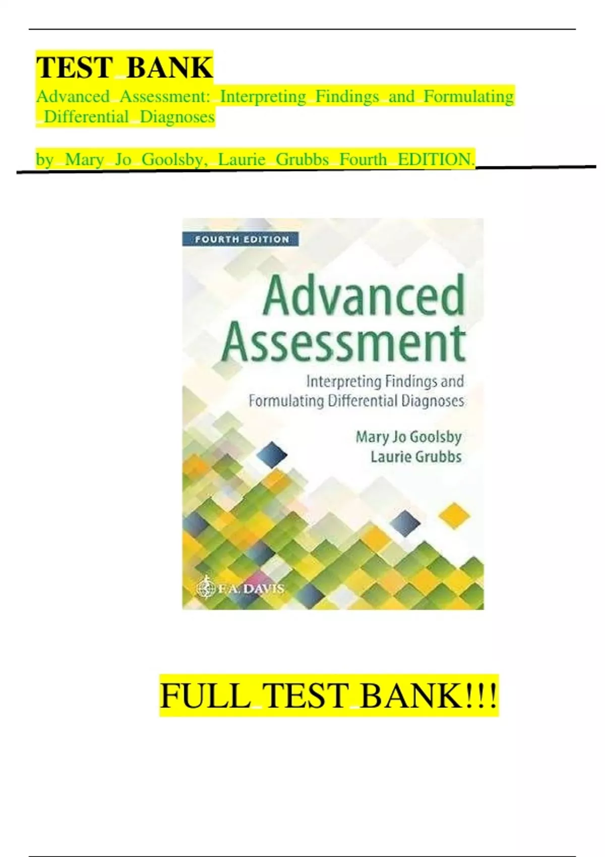 Test Bank For Advanced Assessment Interpreting Findings and Formulating Differential Diagnoses 4th Edition By Mary Jo Goolsby, Laurie Grubbs ISBN:9780803690059 All Chapters 1-22 Fully Covered|COMPLETE GUIDE A+|.