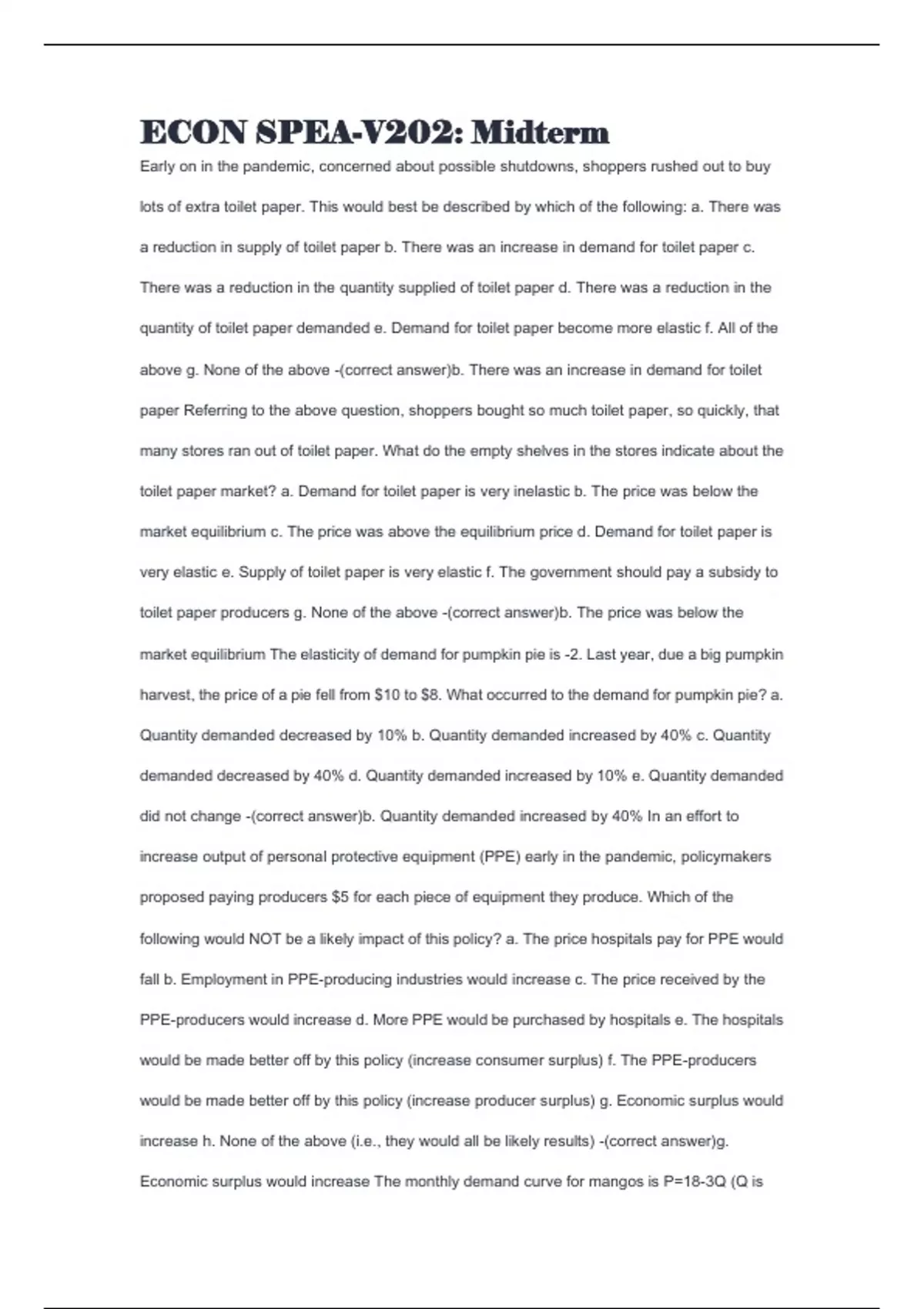 very elastic e. Supply of toilet paper is very elastic f. The government should pay a subsidy to