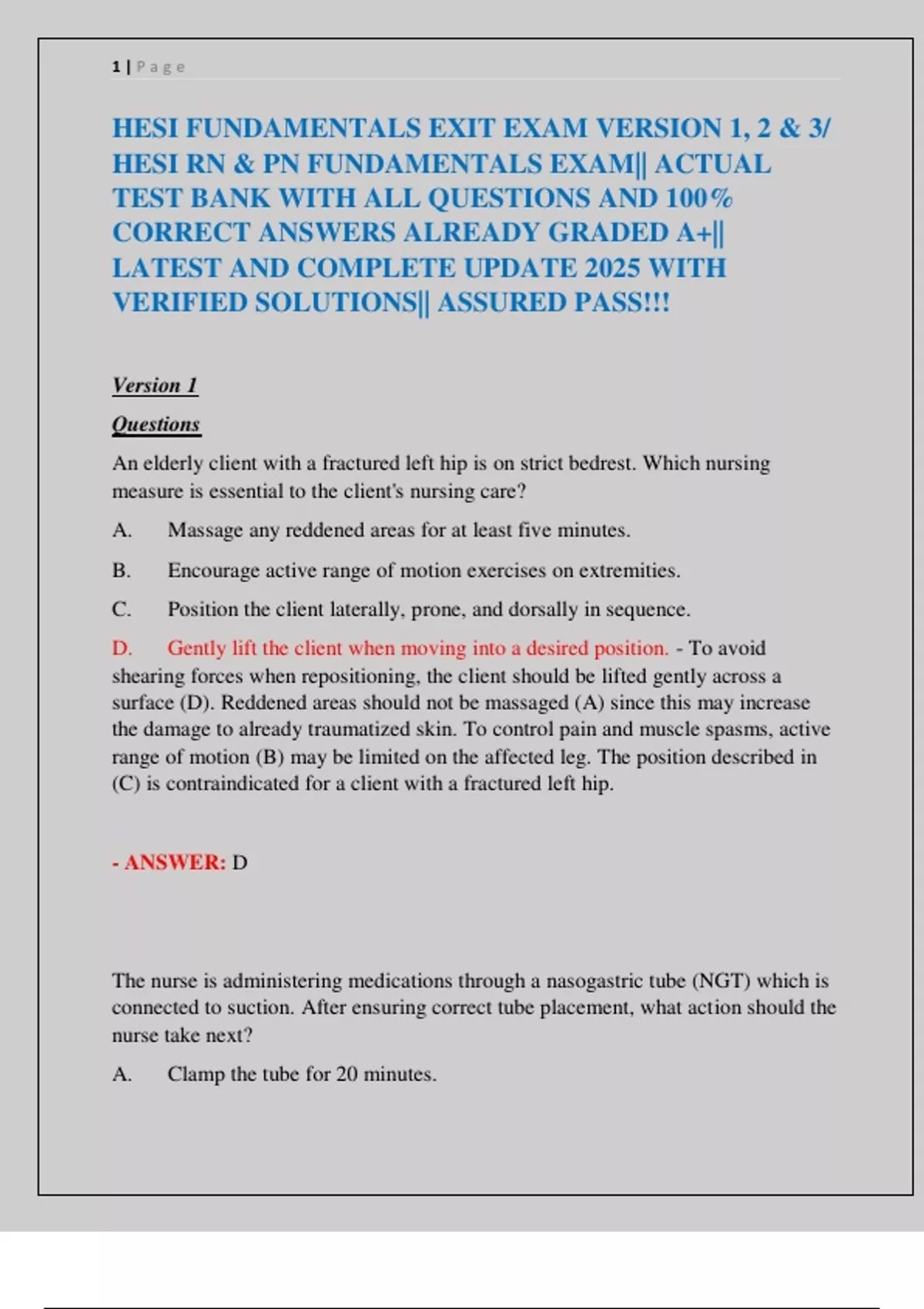 HESI FUNDAMENTALS EXIT EXAM VERSION 1, 2 & 3/