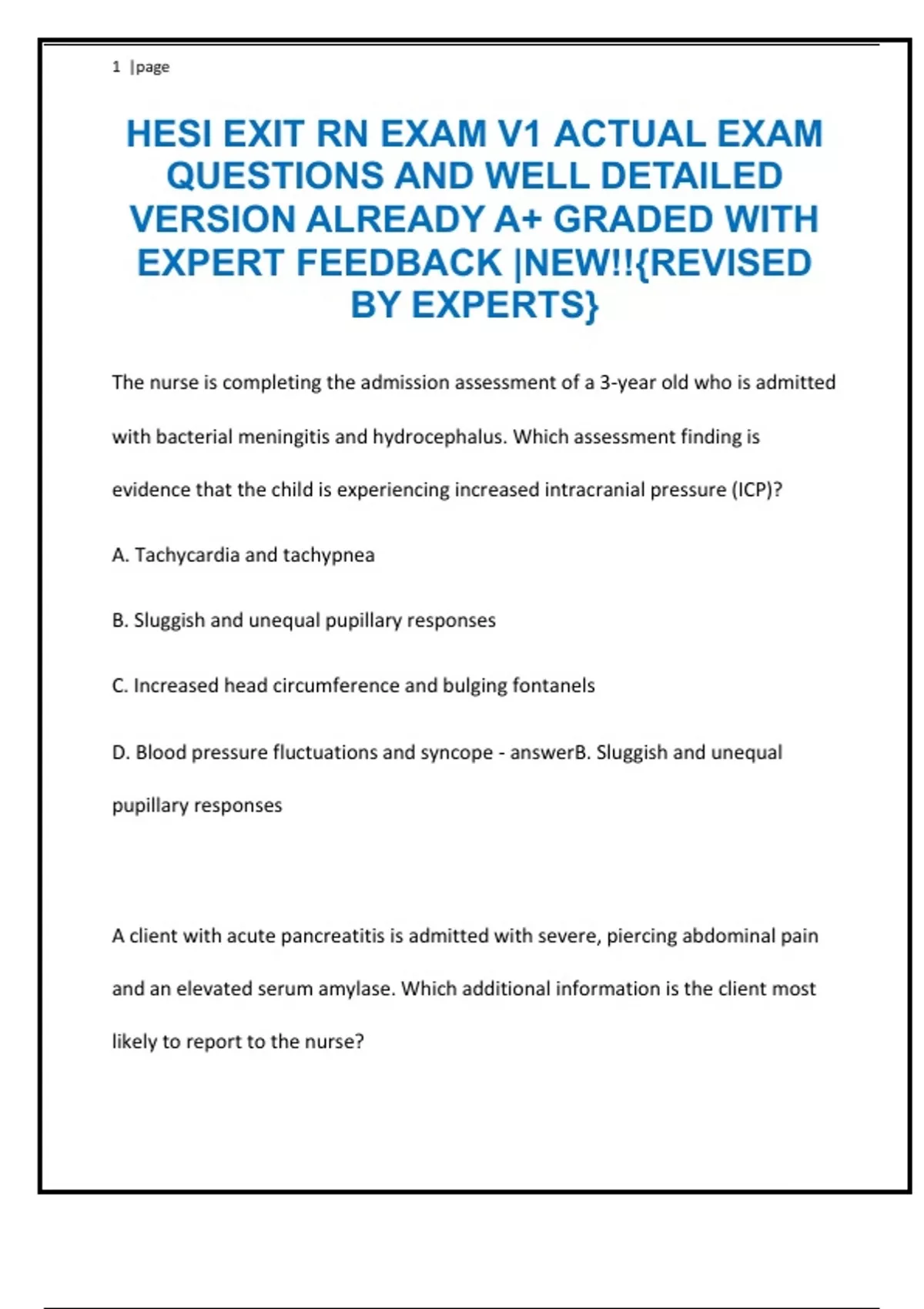 HESI EXIT RN EXAM V1 ACTUAL EXAM QUESTIONS AND WELL DETAILED VERSION ALREADY A+ GRADED WITH EXPERT FEEDBACK |NEW!!{REVISED BY EXPERTS}