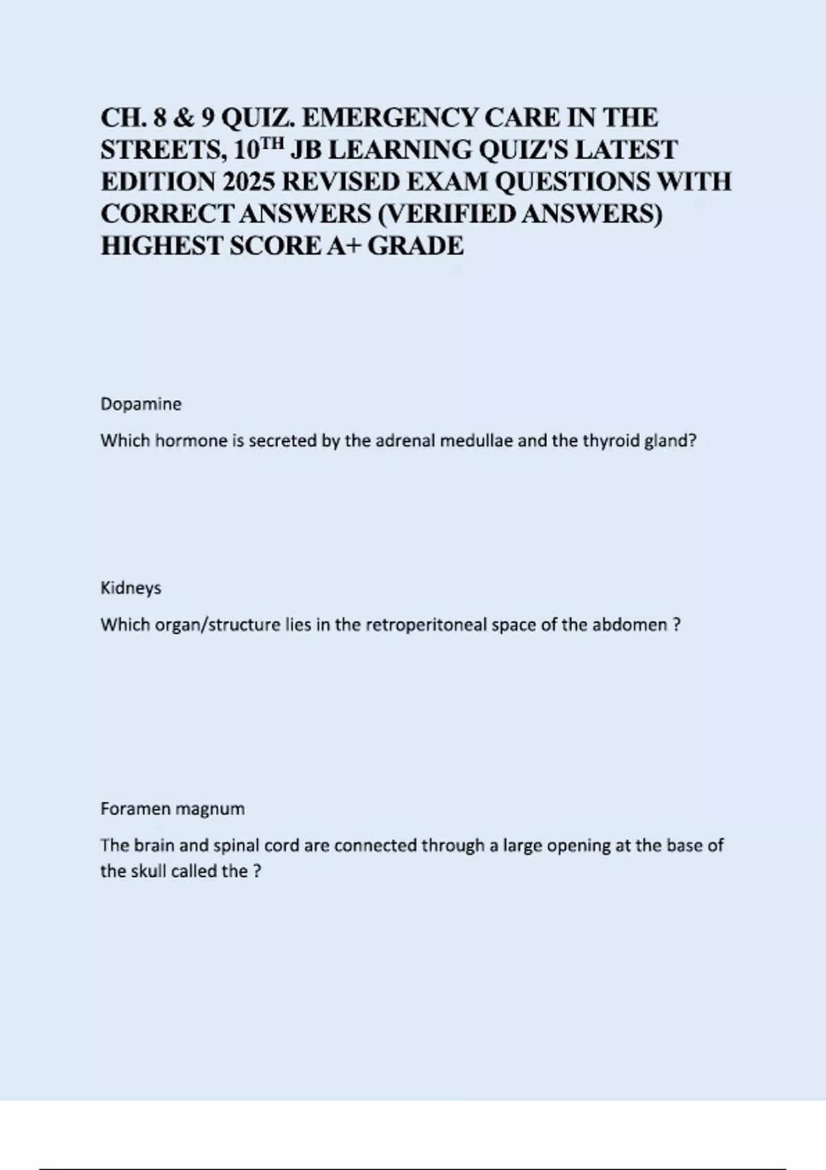 CH. 8 & 9 QUIZ. EMERGENCY CARE IN THE STREETS, 10TH JB LEARNING QUIZ'S LATEST EDITION 2025