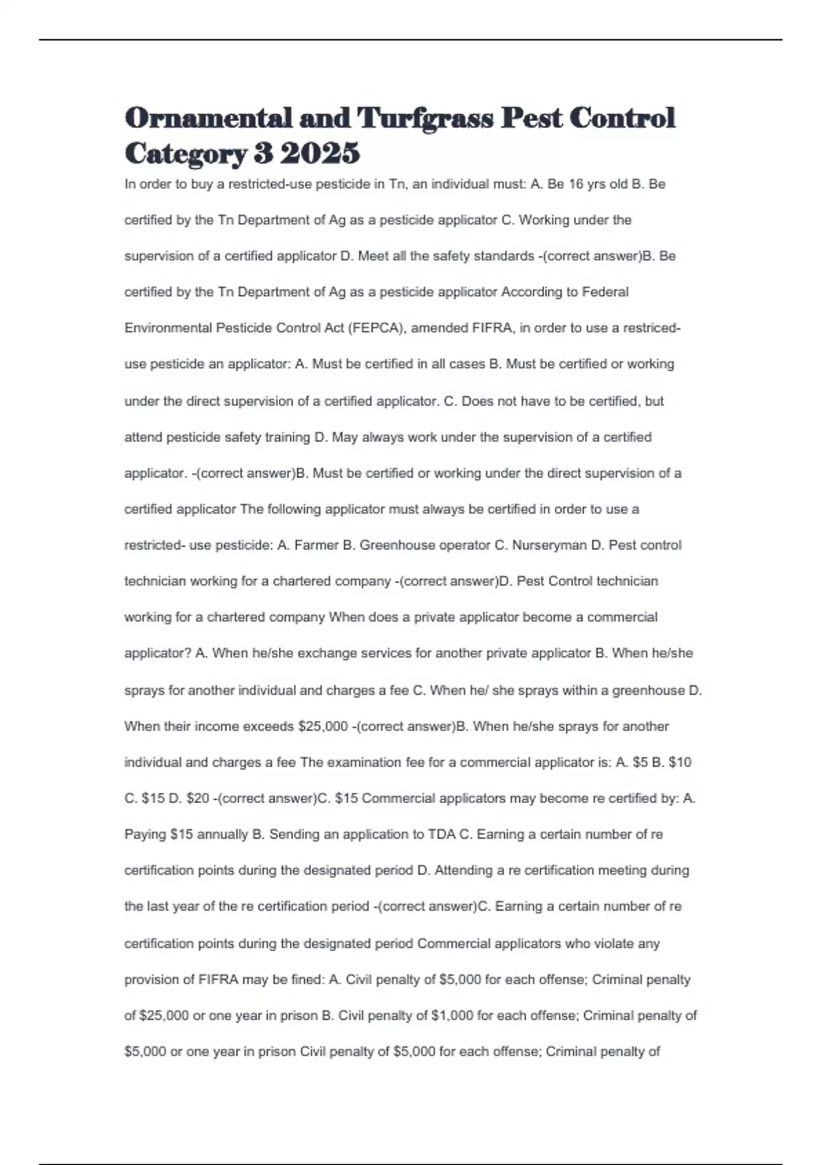 C. $15 D. $20 -(correct answer)C. $15 Commercial applicators may become re certified by: A.