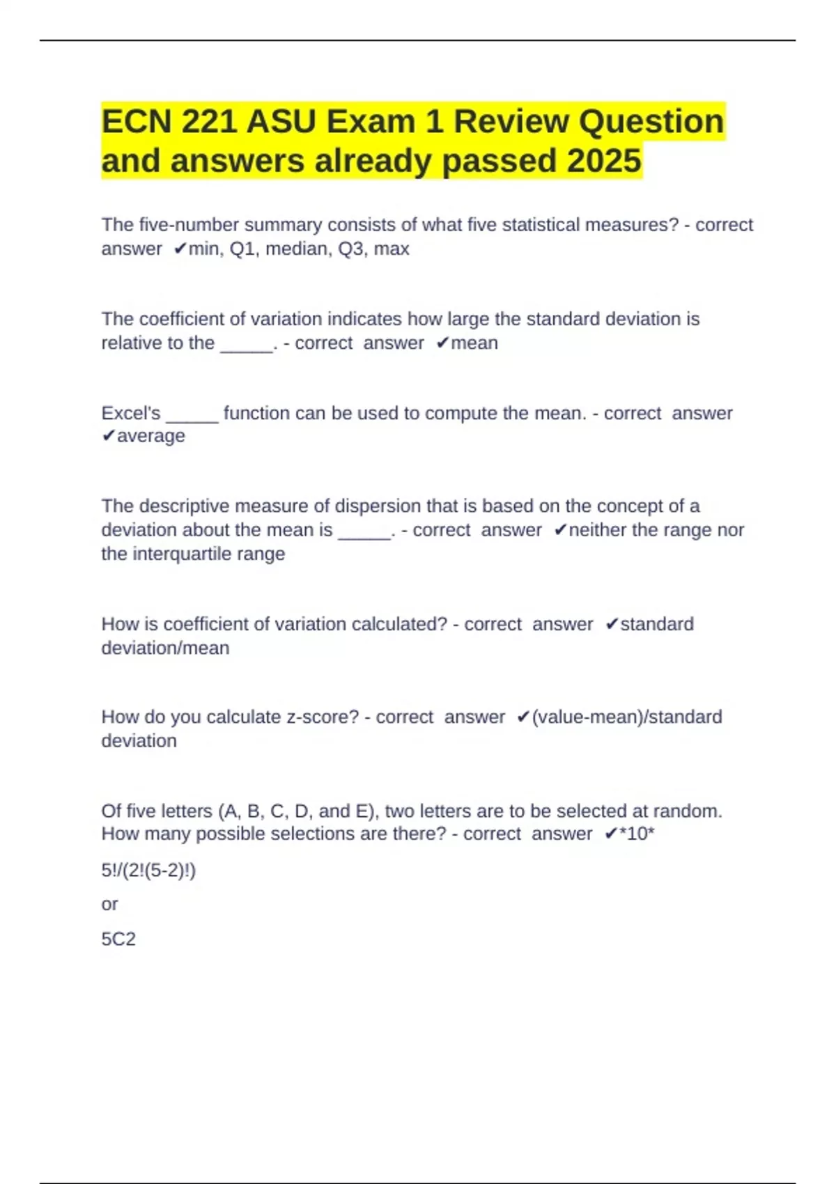 ECN 221 ASU Arizona State University -ECN 221 ASU Exam 1 Review Question and answers already passed 2025 The five-number summary consists of what five statistical measures? - correct answer min, Q1, median, Q3, max The coefficient of variation indicates how large the standard deviation is relative to the _____. - correct answer mean Excel's _____ function can be used to compute the mean. - correct answer average The descriptive measure of dispersion that is based on the concept of a deviation about the mean is _____. - correct answer neither the range nor the interquartile range How is coefficient of variation calculated? - correct answer standard deviation/mean How do you calculate z-score? - correct answer (value-mean)/standard deviation Of five letters (A, B, C, D, and E), two letters are to be selected at random. How many possible selections are there? - correct answer *10* 5!/(2!(5-2)!) or