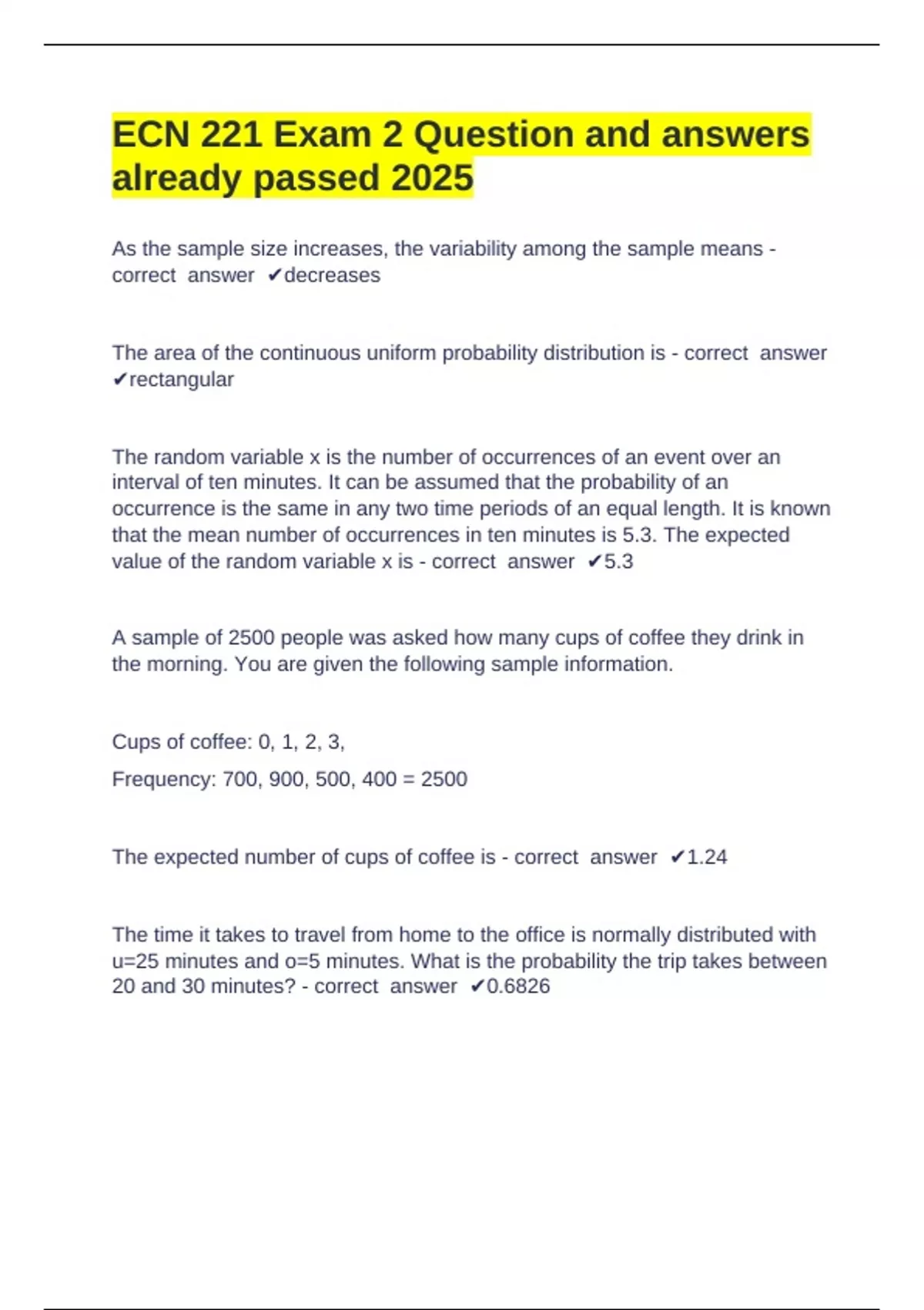 ECN 221 Arizona State University -ECN 221 Exam 2 Question and answers already passed 2025 As the sample size increases, the variability among the sample means - correct answer decreases The area of the continuous uniform probability distribution is - correct answer rectangular The random variable x is the number of occurrences of an event over an interval of ten minutes. It can be assumed that the probability of an occurrence is the same in any two time periods of an equal length. It is known that the mean number of occurrences in ten minutes is 5.3. The expected value of the random variable x is - correct answer 5.3 A sample of 2500 people was asked how many cups of coffee they drink in the morning. You are given the following sample information. Cups of coffee: 0, 1, 2, 3, Frequency: 700, 900, 500, 400 = 2500 The expected number of cups of coffee is - correct answer 1.24 The time it takes to travel from home to the office is normally distributed with u=25 minutes and o=5 minutes. What is the probability the trip takes between 20 and 30 minutes? - correct answer 0.6826 The sample siz