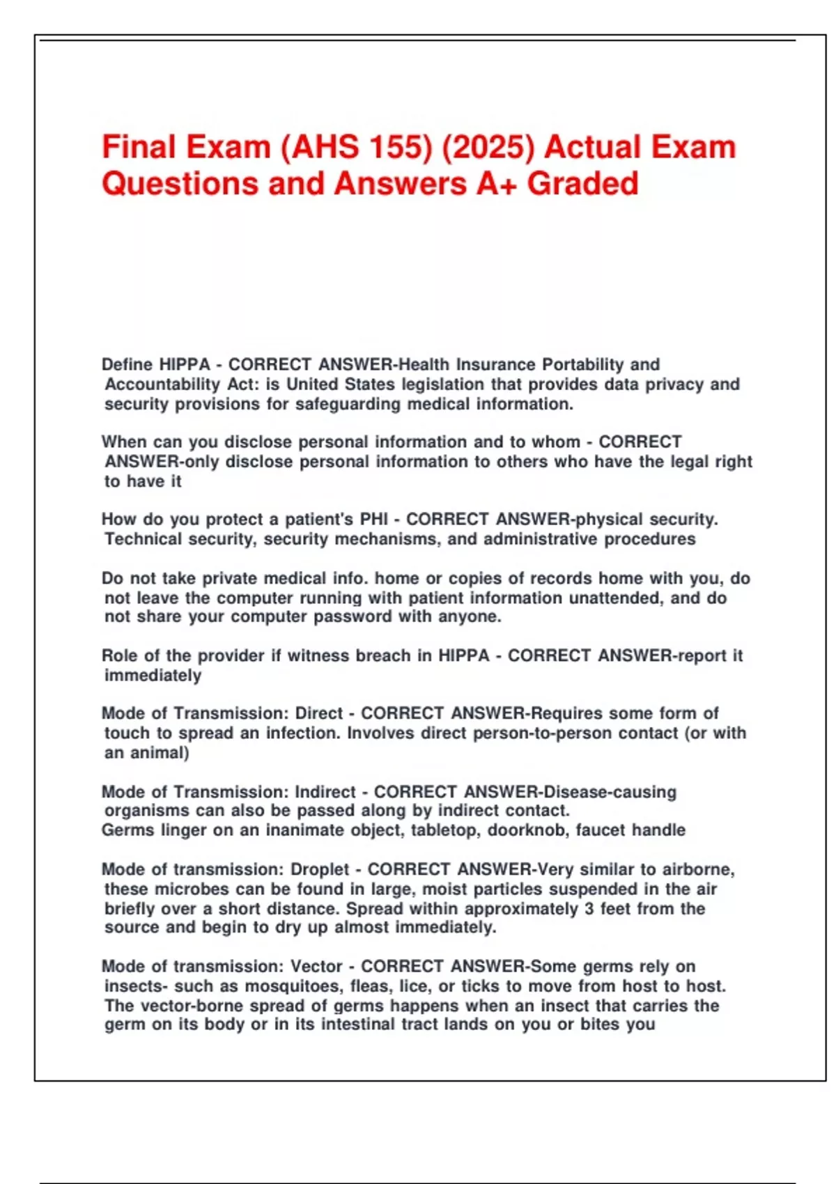 Final Exam (AHS 155) (2025) Actual Exam Questions and Answers A+ Graded.