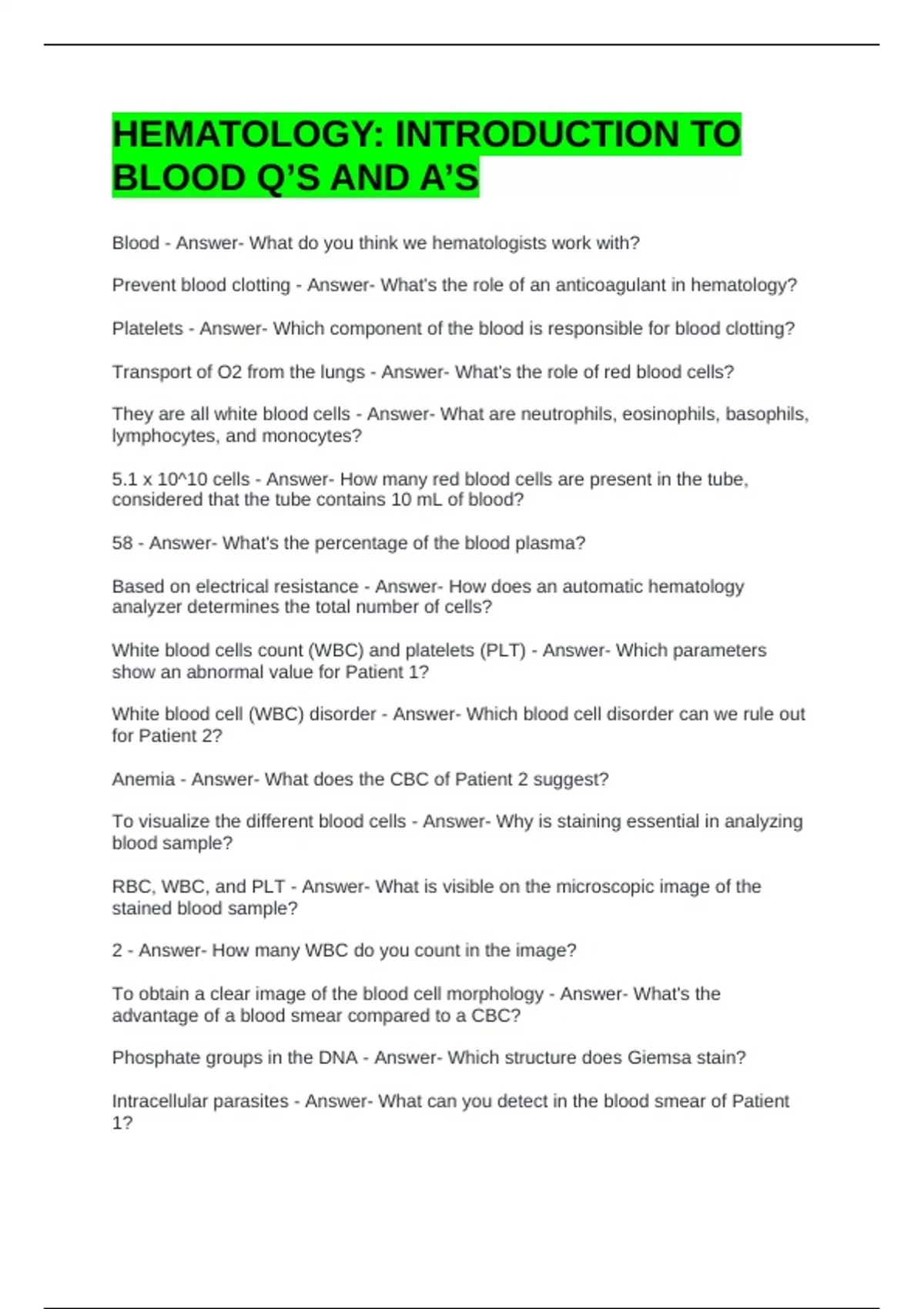 HEMATOLOGY: INTRODUCTION TO BLOOD Q’S AND A’S Blood - Answer- What do you think we hematologists work with? Prevent blood clotting - Answer- What's the role of an anticoagulant in hematology? Platelets - Answer- Which component of the blood is responsible for blood clotting? Transport of O2 from the lungs - Answer- What's the role of red blood cells? They are all white blood cells - Answer- What are neutrophils, eosinophils, basophils, lymphocytes, and monocytes? 5.1 x 10^10 cells - Answer- How many red blood cells are present in the tube, considered that the tube contains 10 mL of blood? 58 - Answer- What's the percentage of the blood plasma? Based on electrical resistance - Answer- How does an automatic hematology analyzer determines the total number of cells? White blood cells count (WBC) and platelets (PLT) - Answer- Which parameters show an abnormal value for Patient 1? White blood cell (WBC) disorder - Answer- Which blood cell disorder can we rule out for Patient 2? Anemia - Answer- What does the CBC of Patient 2 suggest? To visualize the different blood cells - Answer- Why is staining essential in analyzing blood sample? RBC, WBC, and PLT - Answer- What is visible on the microscopic image of the stained blood sample? 2 - Answer- How many WBC do you count in the image? To obtain a clear image of the blood cell morphology - Answer- What's the advantage of a blood smear compared to a CBC? Phosphate groups in the DNA - Answer- Which structure does Giemsa stain? Intracellular parasites - Answer- What can you detect in the blood smear of Patient 1?