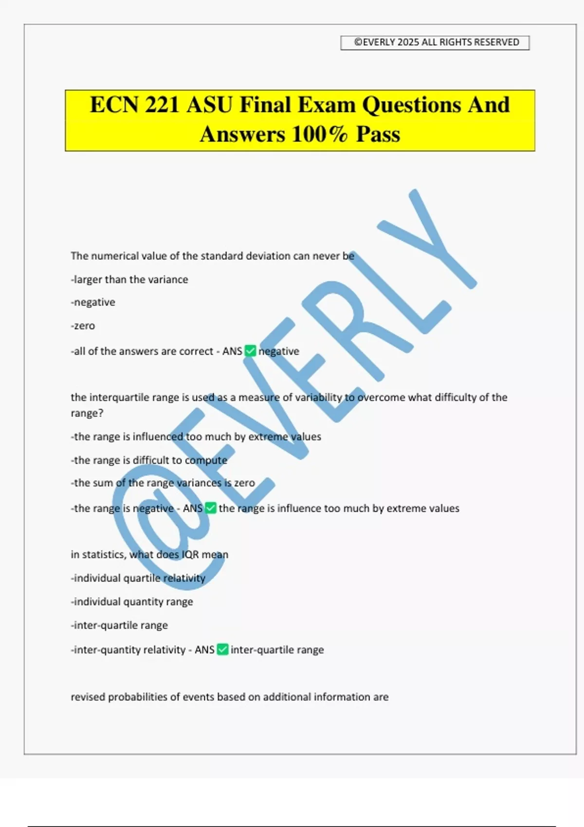 ECN 221 ASU Final Exam Questions And Answers 100% Pass The numerical value of the standard deviation can never be -larger than the variance -negative -zero -all of the answers are correct - ANS negative the interquartile range is used as a measure of variability to overcome what difficulty of the range? -the range is influenced too much by extreme values -the range is difficult to compute -the sum of the range variances is zero -the range is negative - ANS the range is influence too much by extreme values in statistics, what does IQR mean -individual quartile relativity -individual quantity range -inter-quartile range -inter-quantity relativity - ANS inter-quartile range revised probabilities of events based on additional information are ©EVERLY 2025 ALL RIGHTS RESERVED -marginal probabilities -complementary probabilities -posterior probabilities -joint probabilities - ANS posterior probabilities the mean of a standard normal probability distribution -can be any value -none of the answers is correct. -is always equal to 1 -can be any value as long as it is positive - ANS -none of the answers is correct. which of the following is not a characteristic of the normal probability distribution -the distribution is symmetrical. -the standard deviation must be 1. -the mean of the distribution can be negative, zero, or positive. -the mean, median, and mode are equal. - ANS the standard deviation must be 1 the purpose of statistical inference is to provide information about the -experiment based on the information in the population -mean of the sample based upon the mean of the population -population based upon information contained in the population -sample based upon information contained in the population -population based upon information contained in the sample - ANS population based upon information contained in the sample the rejection region for a one-tailed hypothesis test -is in the tail that supports th