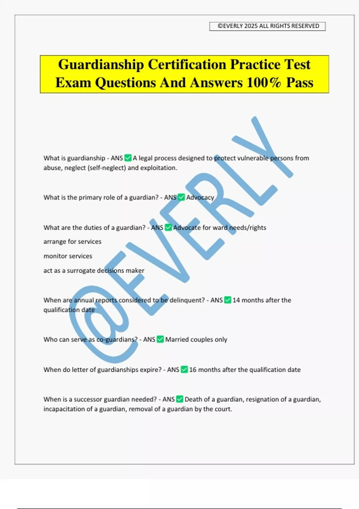 Guardianship Certification Practice Test Exam Questions And Answers 100% Pass What is guardianship - ANS A legal process designed to protect vulnerable persons from abuse, neglect (self-neglect) and exploitation. What is the primary role of a guardian? - ANS Advocacy What are the duties of a guardian? - ANS Advocate for ward needs/rights arrange for services monitor services act as a surrogate decisions maker When are annual reports considered to be delinquent? - ANS 14 months after the qualification date Who can serve as co-guardians? - ANS Married couples only When do letter of guardianships expire? - ANS 16 months after the qualification date When is a successor guardian needed? - ANS Death of a guardian, resignation of a guardian, incapacitation of a guardian, removal of a guardian by the court. ©EVERLY 2025 ALL RIGHTS RESERVED If the guardian dies, what happens to the Ward? - ANS There is no decision maker until a successor guardian is appointed. When does a temporary guardianship expire? - ANS 60 days how often is a guardian required to visit the Ward? - ANS Once a month How often should a guardian visit a Ward? - ANS As often as they can What does POD stand for? - ANS Payable on death A Ward is having sex with another resident of the facility. What is the most appropriate course of action for the guardian to take? - ANS Determine if the sexual acts are consensual A Ward was abused by her brother and is displaying signs of that abuse. The brother now wants to visit with the Ward. What is the most appropriate course of action? - ANS Allow Ward to have supervised visits with her brother if she wants to see him. What is the appropriate venue to file an application of guardianship?> - ANS the court within the county in which the proposed Ward lives. What is the least important factor in decision making regarding Ward?> - ANS Cost Who provides a second opinion regarding serious medical treatment needed for a Ward? - ANS An independent doctor What is the purpose of a Qualified Income Trust (Miller Trust) - ANS To make a person eligible for Medicaid