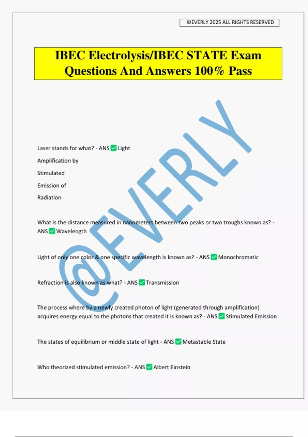IBEC Electrolysis/IBEC STATE Exam Questions And Answers 100% Pass Laser stands for what? - ANS Light Amplification by Stimulated Emission of Radiation What is the distance measured in nanometers between two peaks or two troughs known as? - ANS Wavelength Light of only one color & one specific wavelength is known as? - ANS Monochromatic Refraction is also known as what? - ANS Transmission The process where by a newly created photon of light (generated through amplification) acquires energy equal to the photons that created it is known as? - ANS Stimulated Emission The states of equilibrium or middle state of light - ANS Metastable State Who theorized stimulated emission? - ANS Albert Einstein ©EVERLY 2025 ALL RIGHTS RESERVED The part of the laser that contains the active medium is called? - ANS Resinator cavity What are the states of light in stimulated emission? - ANS Ground State Excited State Singlet State Metastable State Alexandrite laer is in the visible light spectrum at what wavelength? - ANS 755 nm The Nd:YAG laser falls in the invisible light spectrum with a wavelength of what? - ANS 1064 nm What type of wave is used in laser hair removal? - ANS Pulsed wave A chromophore is also know at what? - ANS Target The chromophore absorbs what? - ANS Energy Goggles worn by the patient and practitioner must be approved by which group? - ANS ANSI (American National Standard Institute) for Class 3B and Class 4 Lasers Each laser wavelength is what to its machine? - ANS Specific What are the parameters when doing laser hair removal? - ANS Wavelength Spot Size Fluence ©EVERLY 2025 ALL RIGHTS RESERVED Pulse Width Pulsed lasers allow for selective heating of specific targets, this is also known as? - ANS Selective Photothermolysis The rate/amount of energy delivered within a given area is known as? - ANS Fluence An increase in fluence equals an increase in what? - ANS Heat. Resulting in more damage The length of time the light/energy is in contact with the target that is measured in milliseconds (ms): - ANS Pulse width/Pulse duration If the time of pulse duration is changed from milliseconds to nanoseconds the laser is what? - ANS Q Switched A Q switched laser is used for what? - ANS Tattoo removal Which skin types can tolerate an Alex laser? - ANS 1-4 Which skin types can tolerate a Nd:YAG laser? - ANS All skin types Which skin type should only have electrolysis and no laser? - ANS Type 1 If the pulse width is greater than the thermal relaxation time it results in? - ANS A burn If the pulse width is less than or equal to the thermal relaxation time it results in? - ANS Perfect hair removal