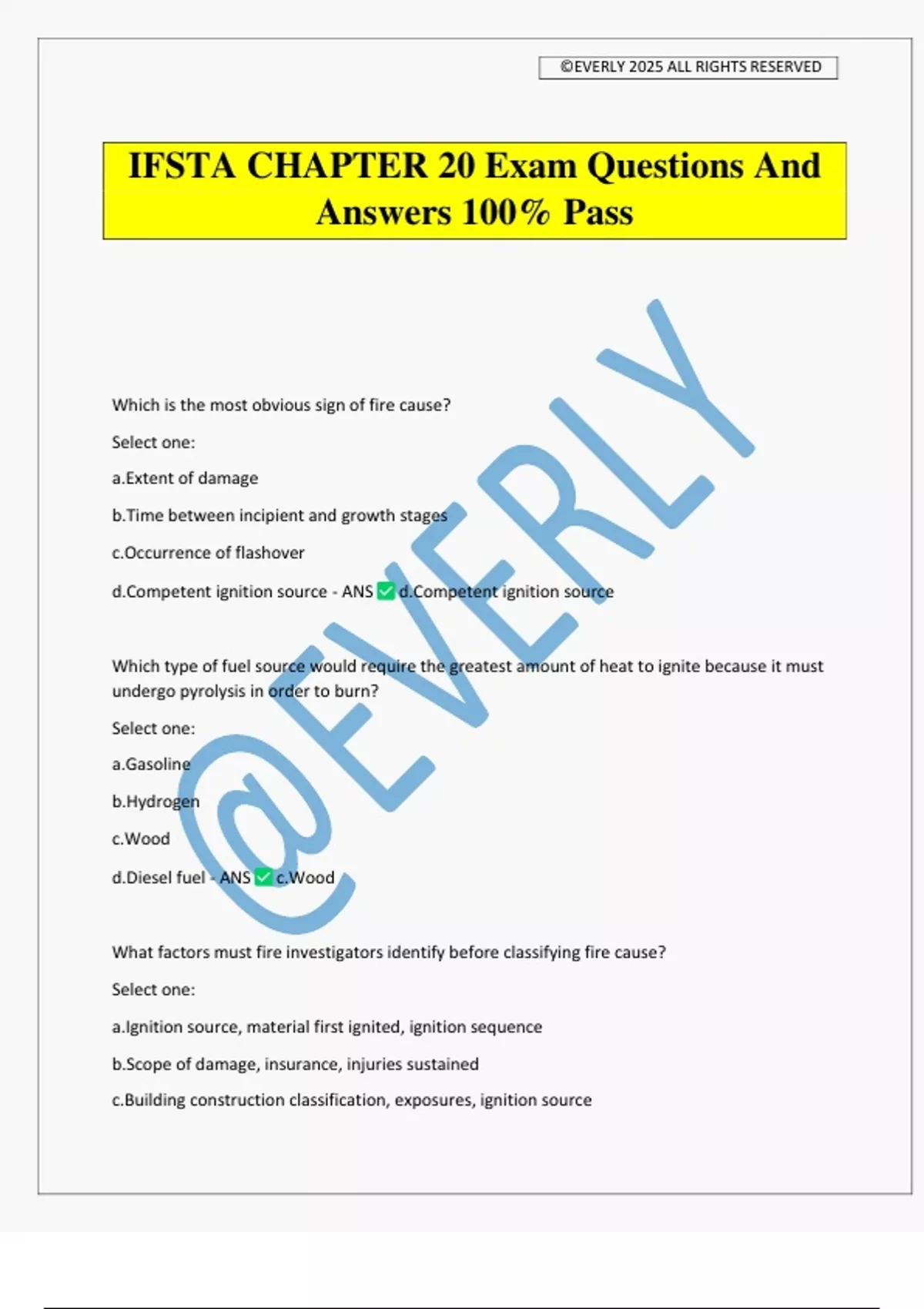 IFSTA CHAPTER 20 Exam Questions And Answers 100% Pass Which is the most obvious sign of fire cause? Select one: a.Extent of damage b.Time between incipient and growth stages c.Occurrence of flashover d.Competent ignition source - ANS d.Competent ignition source Which type of fuel source would require the greatest amount of heat to ignite because it must undergo pyrolysis in order to burn? Select one: a.Gasoline b.Hydrogen c.Wood d.Diesel fuel - ANS c.Wood What factors must fire investigators identify before classifying fire cause? Select one: a.Ignition source, material first ignited, ignition sequence b.Scope of damage, insurance, injuries sustained c.Building construction classification, exposures, ignition source ©EVERLY 2025 ALL RIGHTS RESERVED d.Ignition source, exposures, firefighting tactics used - ANS a.Ignition source, material first ignited, ignition sequence Which action could be considered illegal at a fire scene? Select one: a.Fire department personnel searching for evidence during the course of the fire investigation b.Law enforcement officers informing a suspect of his or her Miranda rights at the scene of a fire investigation c.A homeowner denying the fire department the right of entry after the fire scene has been relinquished d.Fire department personnel giving up control of the scene, but then re-entering without probable cause without a warrant - ANS d.Fire department personnel giving up control of the scene, but then re-entering without probable cause without a warrant How large should the perimeter outside a structure fire be? Select one: a.Large enough to surround the building and any adjacent exposure buildings b.A minimum of 100 feet (30 m) in every direction from the building c.Large enough to surround the building and all potential evidence outside the building d.A minimum of 250 feet (75 m) in every direction from the building - ANS c.Large enough to surround the building and all potential evidence outside the building If someone falls asleep while smoking in bed and their house catches on fire, that would be an example of a(an) _____ fire. Select one: al diary ermined ental - ANS ental