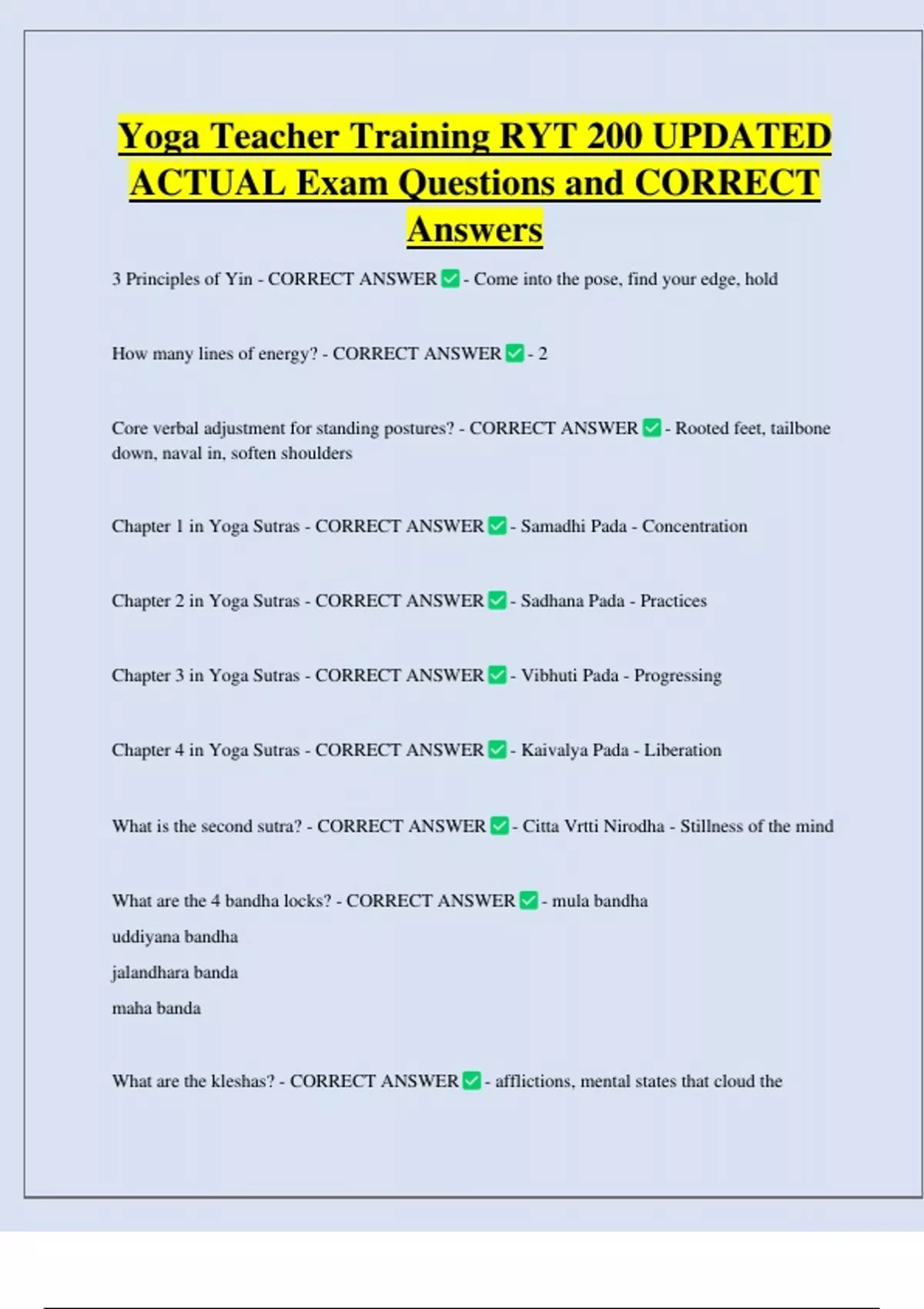 Yoga Teacher Training RYT 200 UPDATED ACTUAL Exam Questions and CORRECT Answers 3 Principles of Yin - CORRECT ANSWER - Come into the pose, find your edge, hold How many lines of energy? - CORRECT ANSWER - 2 Core verbal adjustment for standing postures? - CORRECT ANSWER - Rooted feet, tailbone down, naval in, soften shoulders Chapter 1 in Yoga Sutras - CORRECT ANSWER - Samadhi Pada - Concentration