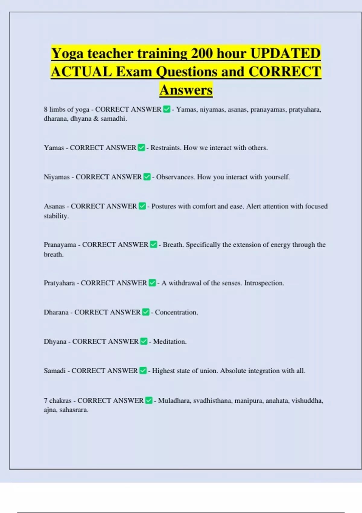 8 limbs of yoga - CORRECT ANSWER - Yamas, niyamas, asanas, pranayamas, pratyahara,