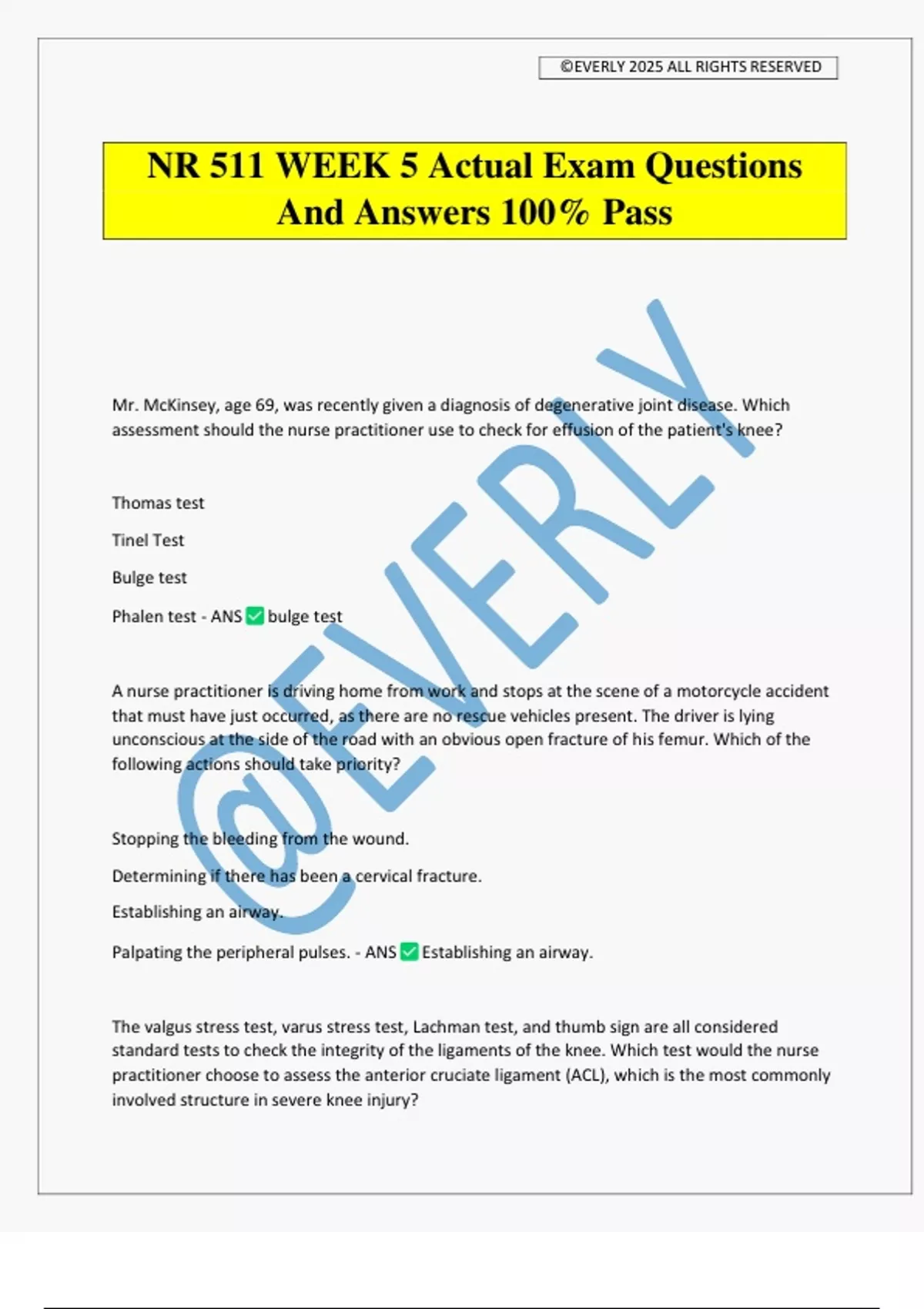 NR 511 WEEK 5 Actual Exam Questions And Answers 100% Pass Mr. McKinsey, age 69, was recently given a diagnosis of degenerative joint disease. Which assessment should the nurse practitioner use to check for effusion of the patient's knee? Thomas test Tinel Test Bulge test Phalen test - ANS bulge test A nurse practitioner is driving home from work and stops at the scene of a motorcycle accident that must have just occurred, as there are no rescue vehicles present. The driver is lying unconscious at the side of the road with an obvious open fracture of his femur. Which of the following actions should take priority? Stopping the bleeding from the wound. Determining if there has been a cervical fracture. Establishing an airway. Palpating the peripheral pulses. - ANS Establishing an airway. The valgus stress test, varus stress test, Lachman test, and thumb sign are all considered standard tests to check the integrity of the ligaments of the knee. Which test would the nurse practitioner choose to assess the anterior cruciate ligament (ACL), which is the most commonly involved structure in severe knee injury? ©EVERLY 2025 ALL RIGHTS RESERVED Valgus stress test. Varus stress test. Lachman test. Thumb sign. - ANS lachman test You are assessing Jamal, age 16, after a football injury to his right knee. You elicit a positive anterior/posterior drawer sign. This test indicates an injury to the: Lateral meniscus. Cruciate ligament. Medial meniscus. Collateral ligament. - ANS cruciate ligament Cass, age 67, tells the nurse practitioner (NP) that she has been diagnosed with a condition that causes sudden flares of pain, swelling, and redness of the joints in her toes. She cannot remember the name of the diagnosis, but she knows it is caused by urate crystals that "get stuck in the joint and cause pain." She is on hydrochlorothiazide (HCTZ) for management of her hypertension. The NP should suspect a diagnosis of: A. Septic arthritis. B. Gout. C. Rheumatoid arthritis.D. Charcot neuro-osteoarthropathy. - ANS gout Ethan, age 10, jumped off a 2-foot wall, twisting his foot and ankle upon landing. His ankle x-ray demonstrates a fracture of the distal tibia, over the articular surface, through the epiphysis and physis. Based on the Salter