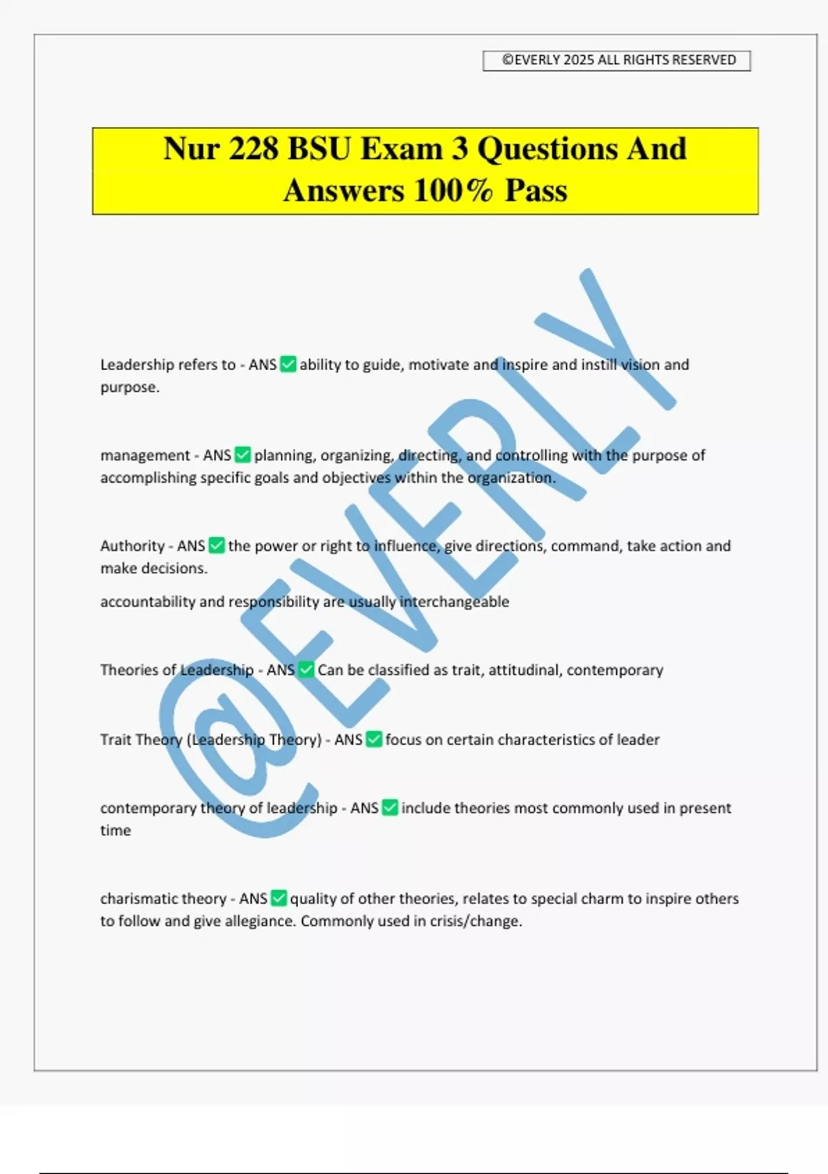 Nur 228 BSU Exam 3 Questions And Answers 100% Pass Leadership refers to - ANS ability to guide, motivate and inspire and instill vision and purpose. management - ANS planning, organizing, directing, and controlling with the purpose of accomplishing specific goals and objectives within the organization. Authority - ANS the power or right to influence, give directions, command, take action and make decisions. accountability and responsibility are usually interchangeable Theories of Leadership - ANS Can be classified as trait, attitudinal, contemporary Trait Theory (Leadership Theory) - ANS focus on certain characteristics of leader contemporary theory of leadership - ANS include theories most commonly used in present time charismatic theory - ANS quality of other theories, relates to special charm to inspire others to follow and give allegiance. Commonly used in crisis/change. ©EVERLY 2025 ALL RIGHTS RESERVED attitudinal theory of leadership - ANS leadership relates to personal attributes (height, social background, creativity, assertiveness, integrity, ability, intelligence etc) Leadership Styles - ANS autocratic/authoritarian, democratic/participative, laissez- faire/permissive modeling - ANS when nurse comes to understand patients perspective autocratic/authoritarian leadership - ANS -dictates work to be done -majority of decisions determined by manager -gives little to no opportunity for input -communication flows downwards -works well in emergencies and preferred inexperienced/uneducated employees Democratic/Participative leadership - ANS -input and decision making encouraged - leaders see themselves as coworker/partnership -communication, consensus, and teamwork stressed -communication flows up and down -human relationships important -preferred style in most work situations -leaders lead by supporting coworkers multicratic leadership - ANS -combines most favorable aspects of all styles -most used in healthcare - transformational leaders info and decision making with employees -informed workers developing into self-directed teams-collaborative or shared leadership style where individuals closest to the problem helping find solutions.