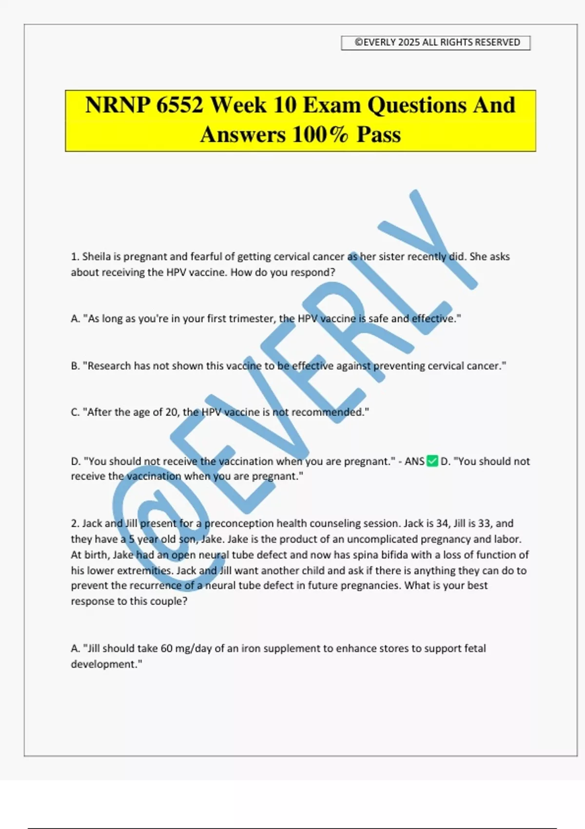 1. Sheila is pregnant and fearful of getting cervical cancer as her sister recently did. She asks