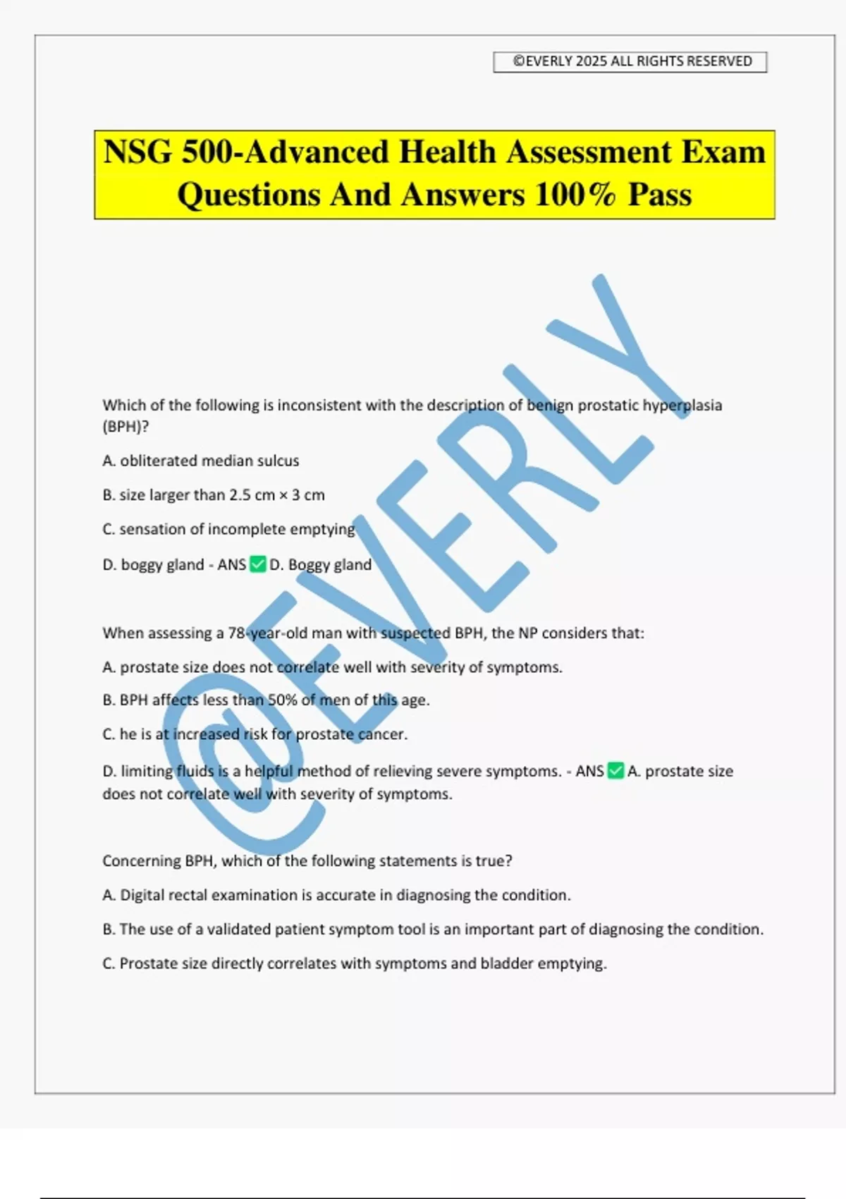 NSG 500-Advanced Health Assessment Exam Questions And Answers 100% Pass Which of the following is inconsistent with the description of benign prostatic hyperplasia (BPH)? A. obliterated median sulcus B. size larger than 2.5 cm × 3 cm C. sensation of incomplete emptying D. boggy gland - ANS D. Boggy gland When assessing a 78-year-old man with suspected BPH, the NP considers that: A. prostate size does not correlate well with severity of symptoms. B. BPH affects less than 50% of men of this age. C. he is at increased risk for prostate cancer. D. limiting fluids is a helpful method of relieving severe symptoms. - ANS A. prostate size does not correlate well with severity of symptoms. Concerning BPH, which of the following statements is true? A. Digital rectal examination is accurate in diagnosing the condition. B. The use of a validated patient symptom tool is an important part of diagnosing the condition. C. Prostate size directly correlates with symptoms and bladder emptying. ©EVERLY 2025 ALL RIGHTS RESERVED D. Bladder distention is usually present in early disease. - ANS B. The use of a validated patient symptom tool is an important part of diagnosing the condition. The presentation of acute epididymitis in an otherwise-well 22-year-old man includes: A. the presence of a positive Prehn sign B. low back pain. C. absent cremasteric reflex. D. diffuse abdominal pain. - ANS A. the presence of a positive Prehn sign Risk factors for prostate cancer include all of the following except: A. African ancestry. B. history of genital trauma. C. family history of prostate cancer. D. high-fat diet. - ANS B. history of genital trauma. A 24-year-old man presents with sudden onset of left-sided scrotal pain. He reports having intermittent unilateral testicular pain in the past but not as severe this current episode. Confirmation of testicular torsion would include all of the following findings except: A. unilateral loss of the cremasteric reflex. B. the affected testicle held higher in the scrotum. C. testicular swelling. D. relief of pain with scrotal elevation. - ANS D. relief of pain with scrotal elevation. In assessing a man with testicular torsion, the NP is most likely to note: A. elevated PSA level. B. white blood cells reported in urinalysis. C. left testicle most often affected. ©EVERLY 2025 ALL RIGHTS RESERVED D. increased testicular blood flow by color-flow Doppler ultrasound. - ANS C. left testicle most often affected Which is the most potent risk factor for PVD? A. HTN B. older age C. cigarette smoking D. leg injury - ANS C. cigarette smoking Typically, the earliest sign of venous insufficiency is: A. edema B. altered pigmentation C. skin atrophy D. shiny skin - ANS A. edema What is the "lub" or the S1 sound? - ANS Closure of the AV valves Beginning of systole What is the "dub" or the S2 sound? - ANS Closure of the semi lunar valves End of systole Where is the S1 the loudest? - ANS APEX "S1=1=A" (a for ap