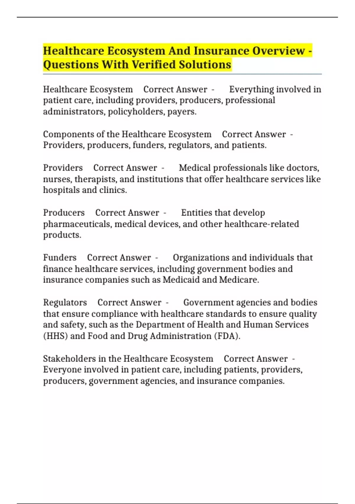 Healthcare Ecosystem And Insurance Overview - Questions With Verified Solutions