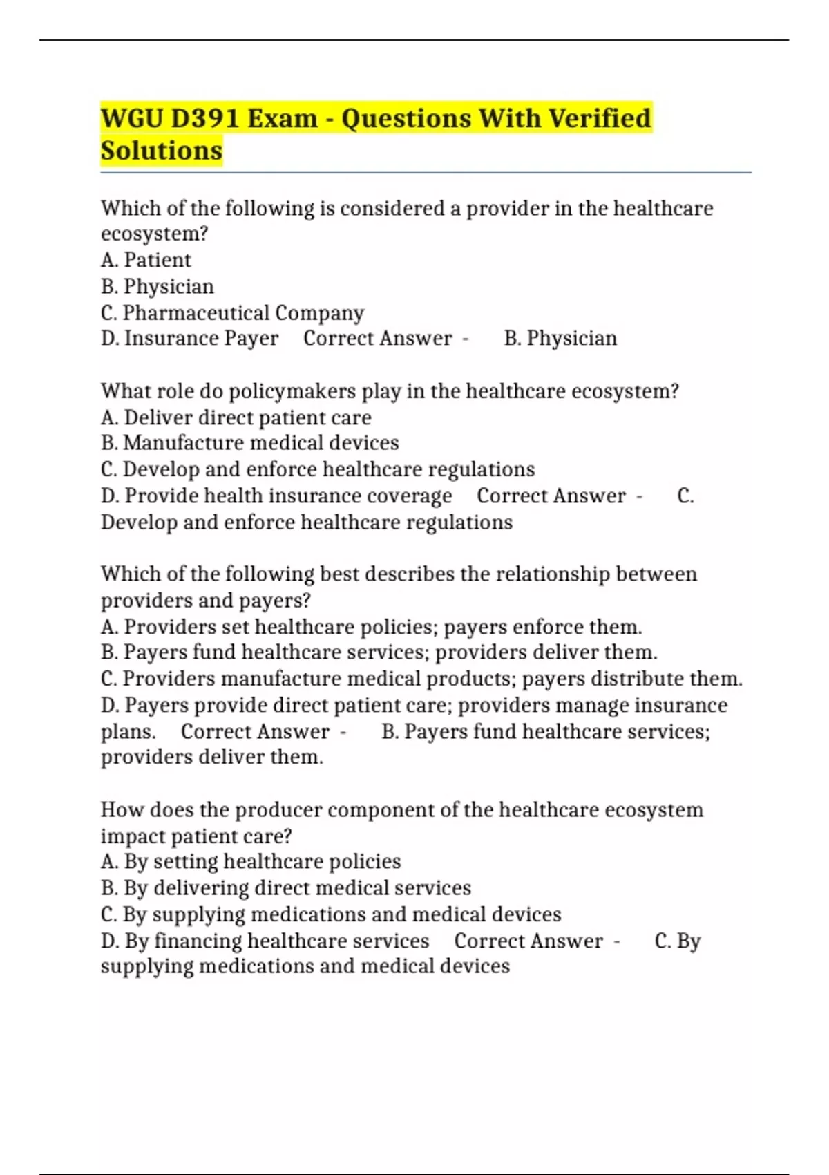 plans. Correct Answer - B. Payers fund healthcare services;