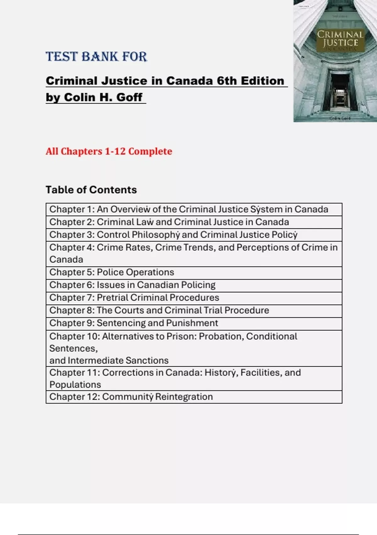 This document contains the full test bank for all 12 chapters of Criminal Justice in Canada (6th edition) by Colin H. Goff. It includes a wide variety of assessment questions such as multiple-choice, true/false, and application-based scenarios that align with Canadian criminal justice concepts, institutions, and practices. A valuable tool for students preparing for exams or reviewing key topics in Canadian criminal law and justice systems.