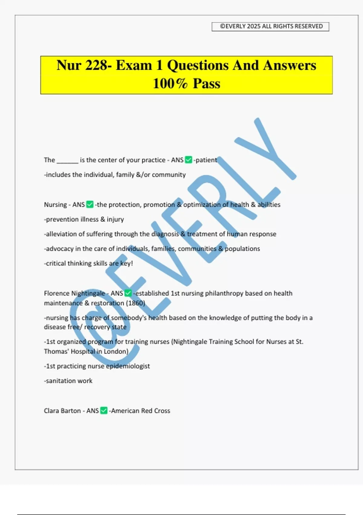 Nur 228- Exam 1 Questions And Answers 100% Pass The ______ is the center of your practice - ANS -patient -includes the individual, family &/or community Nursing - ANS -the protection, promotion & optimization of health & abilities -prevention illness & injury -alleviation of suffering through the diagnosis & treatment of human response -advocacy in the care of individuals, families, communities & populations -critical thinking skills are key! Florence Nightingale - ANS -established 1st nursing philanthropy based on health maintenance & restoration (1860) -nursing has charge of somebody's health based on the knowledge of putting the body in a disease free/ recovery state -1st organized program for training nurses (Nightingale Training School for Nurses at St. Thomas' Hospital in London) -1st practicing nurse epidemiologist -sanitation work Clara Barton - ANS -American Red Cross ©EVERLY 2025 ALL RIGHTS RESERVED Mary Mahoney - ANS -1st professionally trained African American nurse -respect for the individual -better relationships for culture and races influences on nursing - ANS -health care reform -increase in population -medically underserved -threat of bioterrorism -rising health care costs -nursing shortage Nursing shortage - ANS -results from insufficient qualified RNs to fill vacant positions & loss of qualified RNs to other professions ANA standards of nursing practicing & standards of professional performance - ANS - describe a comptent level of nursing care -READ ABOUT THIS Code of Ethics - ANS -philosophical ideals of right and wrong that define the principles you ill use to provide care to your patients -important to incorporate your own values and ethics in your practice registered nurse (RN) - ANS -completion of an associate (2 years) or baccalaureate (4 years) degree program, then take NCLEX-RN Nurse educator, nurse administrator, and advanced practice registered nurse (APRN) - ANS - master's or doctoral degree... DSN & PhD -APRN is the most independently functioning ©EVERLY 2025 ALL RIGHTS RESERVED in-service education - ANS -instruction or training provided by a health care agency or institution -often focused on new technologies -will always have to do Nurse Practice Arts (NPA) - ANS -regulate the scope of nursing practice and protect public health, safety, and welfare profession responsibilities and roles - ANS -provide care and comfort and to emphasize health promotion and illness prevention -autonomy & accountability -caregiver -patient advocate -educator -communicator= essential -manager caregiver - ANS -help patients maintain & regain health, manage disease & symptoms, & attain a maximal level function & independence through the healing process -provide healing through both physical and interpersonal skills patient advocate - ANS -protect your patient's human & legal rights & provide assistance in asserting these rights if the need arises educator - ANS -ex