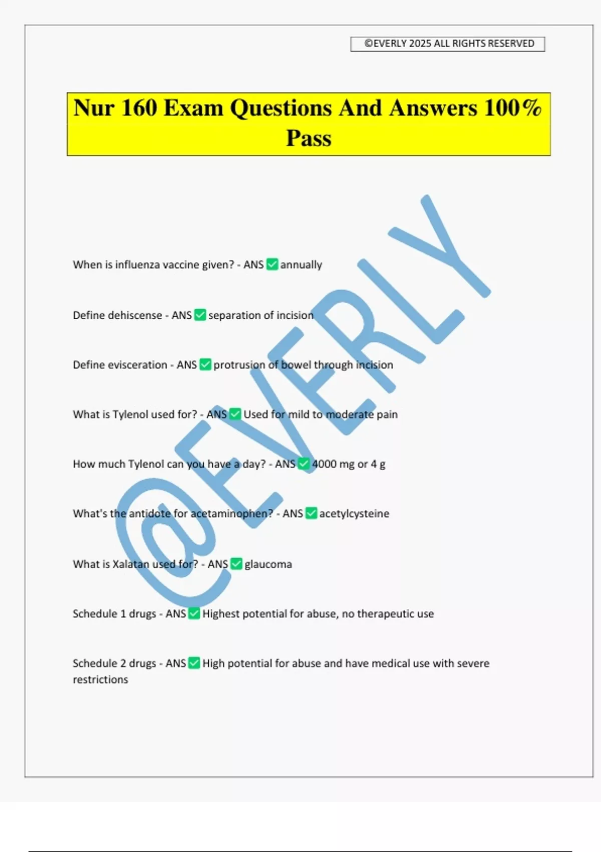 Nur 160 Exam Questions And Answers 100% Pass When is influenza vaccine given? - ANS annually Define dehiscense - ANS separation of incision Define evisceration - ANS protrusion of bowel through incision What is Tylenol used for? - ANS Used for mild to moderate pain How much Tylenol can you have a day? - ANS 4000 mg or 4 g What's the antidote for acetaminophen? - ANS acetylcysteine What is Xalatan used for? - ANS glaucoma Schedule 1 drugs - ANS Highest potential for abuse, no therapeutic use Schedule 2 drugs - ANS High potential for abuse and have medical use with severe restrictions