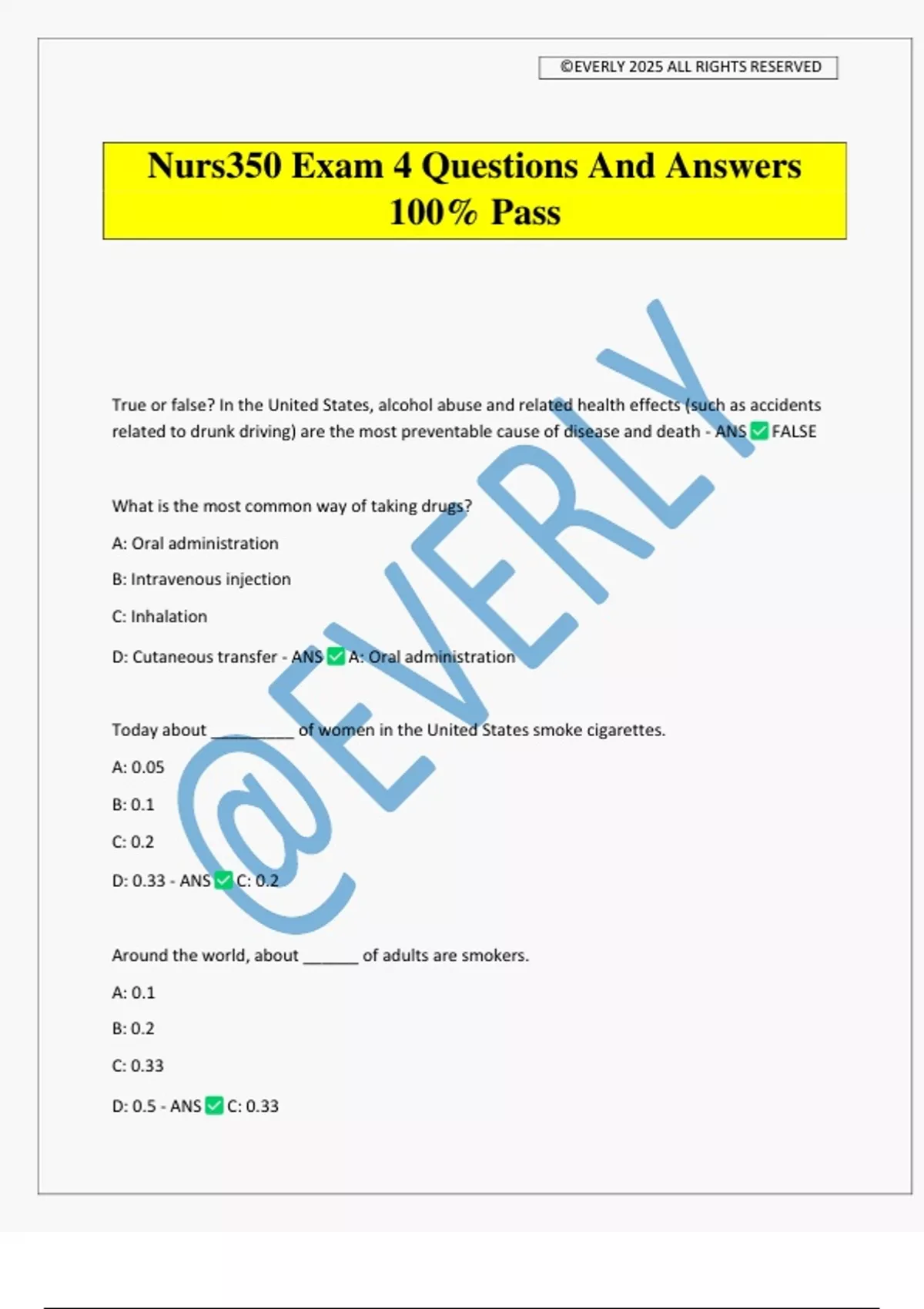 Nurs350 Exam 4 Questions And Answers 100% Pass True or false? In the United States, alcohol abuse and related health effects (such as accidents related to drunk driving) are the most preventable cause of disease and death - ANS FALSE What is the most common way of taking drugs? A: Oral administration B: Intravenous injection C: Inhalation D: Cutaneous transfer - ANS A: Oral administration Today about _________ of women in the United States smoke cigarettes. A: 0.05 B: 0.1 C: 0.2 D: 0.33 - ANS C: 0.2 Around the world, about ______ of adults are smokers. A: 0.1 B: 0.2 C: 0.33 D: 0.5 - ANS C: 0.33 ©EVERLY 2025 ALL RIGHTS RESERVED Children and babies exposed to environmental tobacco smoke ("secondhand smoking") are most likely to develop which of the following diseases? A: Asthma B: Lung cancer C: Heart disease D: Emphysema - ANS A: Asthma True or false? Women are more likely than men to drink alcohol. - ANS FALSE Why is taking alcohol with prescription medications potentially dangerous? A: The combined effect of the medication and the alcohol can be much greater than the effect of either the medication or the alcohol alone. B: Many medications can mask the effects of alcohol, making a woman feel less intoxicated than she really is. C: The alcohol can negate the effects of many important medications, causing them to be ineffective. D: Taken together, prescription medications and alcohol can cause spontaneous human combustion. - ANS A: The combined effect of the medication and the alcohol can be much greater than the effect of either the medication or the alcohol alone. True or false? The identical twin of an alcoholic, if adopted and raised in a healthy, alcohol-free environment, is no more or less likely to become an alcoholic than another person raised in the same circumstances. - ANS FALSE In the 1950s and 1960s, doctors often prescribed __________ to middle-class women to help them deal with stress. A: cocaine B: marijuana C: amphetamines