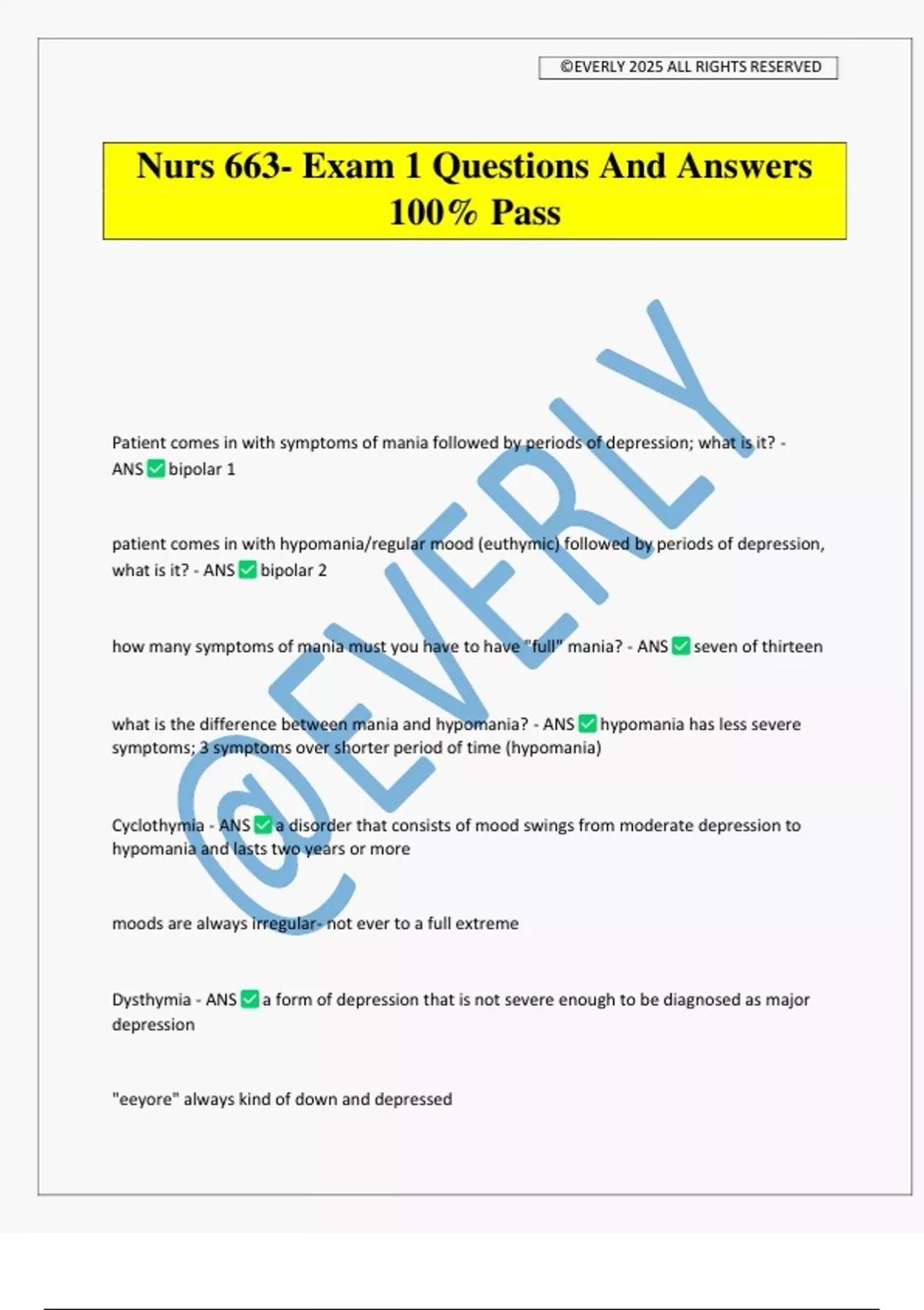 Dysthymia - ANS a form of depression that is not severe enough to be diagnosed as major