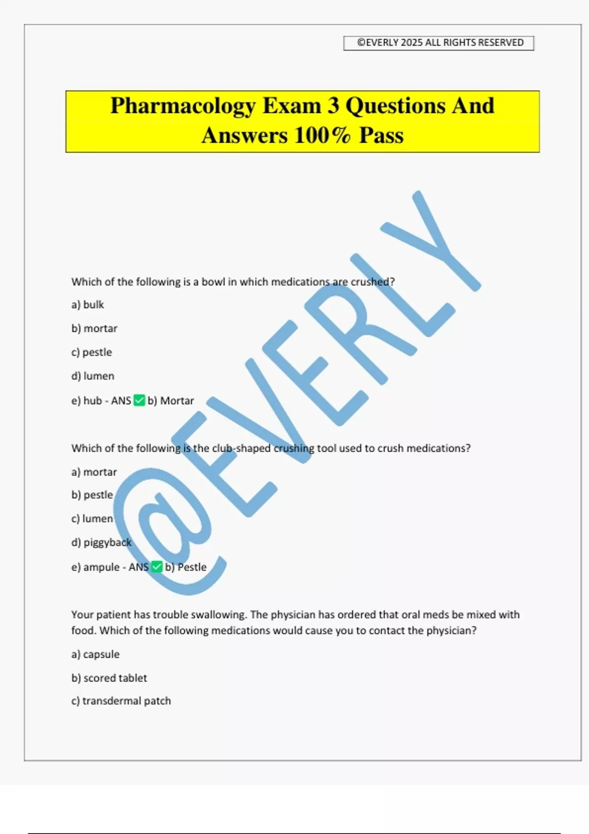 Pharmacology Exam 3 Questions And Answers 100% Pass Which of the following is a bowl in which medications are crushed? a) bulk b) mortar c) pestle d) lumen e) hub - ANS b) Mortar Which of the following is the club-shaped crushing tool used to crush medications? a) mortar b) pestle c) lumen d) piggyback e) ampule - ANS b) Pestle Your patient has trouble swallowing. The physician has ordered that oral meds be mixed with food. Which of the following medications would cause you to contact the physician? a) capsule b) scored tablet c) transdermal patch ©EVERLY 2025 ALL RIGHTS RESERVED d) time-release tablet e) suppository - ANS d) Time-Release tablet Which of these actions is not necessary when injecting an oral dose using an oral syringe? a) instructing the patient b) securely attaching the needle to the syringe c) thoroughly washing the hands d) checking the order three times e) pulling back on the plunger to draw up liquid - ANS b) Securely attaching the needle to the syringe Which of the following describes a presorted individualized dosage carrier? a) blister pack b) bulk container c) controlled substance d) meniscus - ANS a) Blister Pack Enteral medications include all of the following except: a) capsules b) tablets c) transdermal patches d) enemas - ANS c) Transdermal Contraindications for using the oral route include all of the following except: a) nausea b) vomiting c) difficulty swallowing ©EVERLY 2025 ALL RIGHTS RESERVED d) diarrhea - ANS d) Diarrhea Medications that are given to prevent release in the stomach or improve swallowing are: a) enteric-coated b) scored c) buffered d) time-release - ANS a) Enteric-coated Tablets that are marked in halves for easy separation are: a) enteric-coated b) scored c) buffered d) time-release - ANS b) Scored Tablets that have antacids added to them to prevent stomach irritation are: a) enteric-coated b) scored c) buffered d) time-release - ANS c) Buffered Capsules that are manufactured to be absorbed in the small intestine, instead of the stomach, are known as: a) enteric-coated b) scored c) buffered d) time-release - ANS d) Time-release