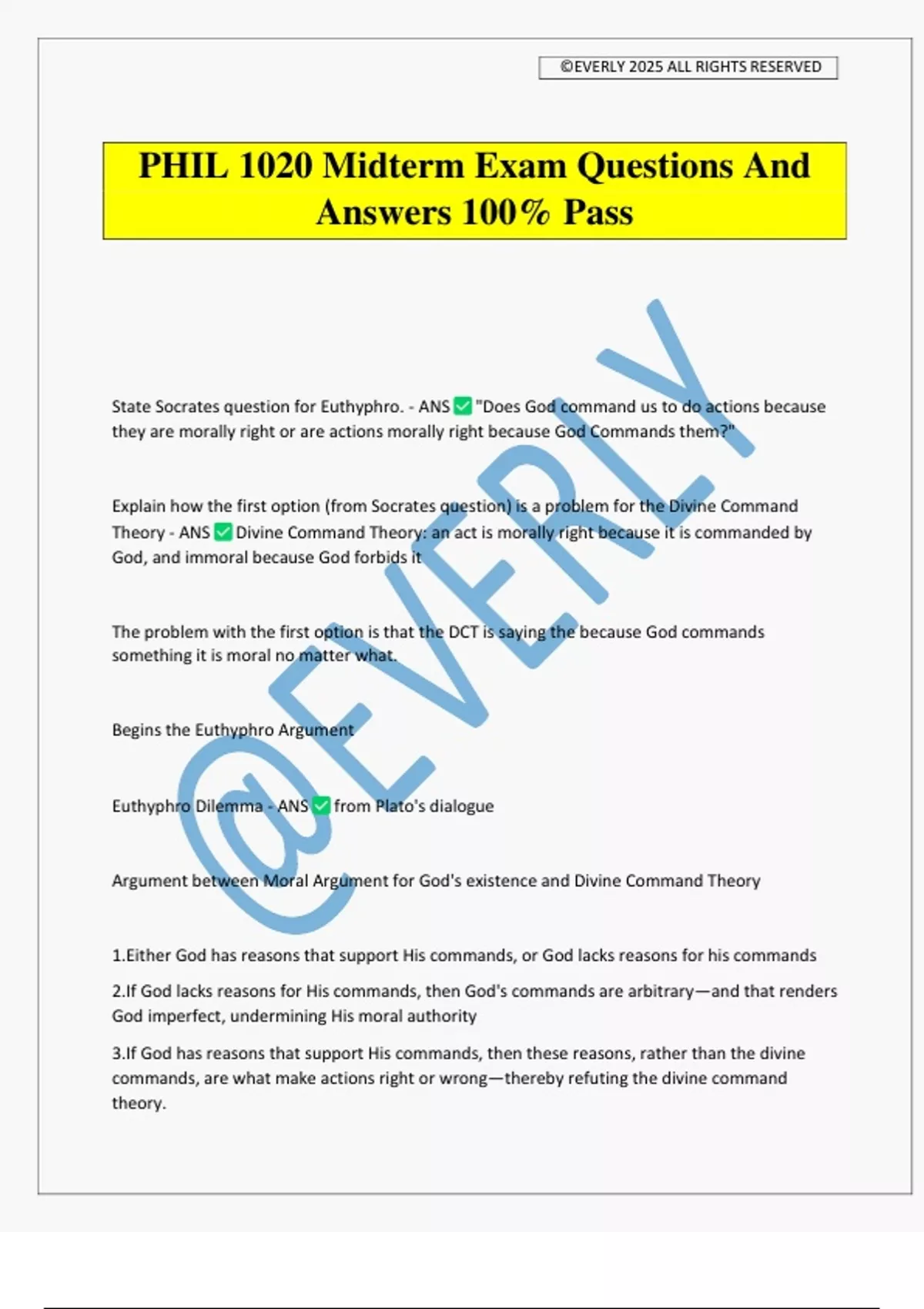 PHIL 1020 Midterm Exam Questions And Answers 100% Pass State Socrates question for Euthyphro. - ANS "Does God command us to do actions because they are morally right or are actions morally right because God Commands them?" Explain how the first option (from Socrates question) is a problem for the Divine Command Theory - ANS Divine Command Theory: an act is morally right because it is commanded by God, and immoral because God forbids it The problem with the first option is that the DCT is saying the because God commands something it is moral no matter what. Begins the Euthyphro Argument Euthyphro Dilemma - ANS from Plato's dialogue Argument between Moral Argument for God's existence and Divine Command Theory 1.Either God has reasons that support His commands, or God lacks reasons for his commands 2.If God lacks reasons for His commands, then God's commands are arbitrary—and that renders God imperfect, undermining His moral authority 3.If God has reasons that support His commands, then these reasons, rather than the divine commands, are what m