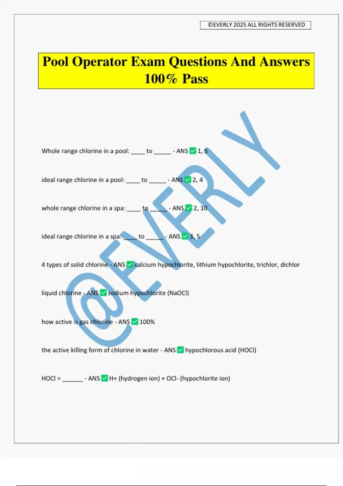 Pool Operator Exam Questions And Answers 100% Pass Whole range chlorine in a pool: ____ to _____ - ANS 1, 5 ideal range chlorine in a pool: ____ to _____ - ANS 2, 4 whole range chlorine in a spa: ____ to _____ - ANS 2, 10 ideal range chlorine in a spa: ____ to _____ - ANS 3, 5 4 types of solid chlorine - ANS calcium hypochlorite, lithium hypochlorite, trichlor, dichlor liquid chlorine - ANS sodium hypochlorite (NaOCl) how active is gas chlorine - ANS 100% the active killing form of chlorine in water - ANS hypochlorous acid (HOCl) HOCl = ______ - ANS H+ (hydrogen ion) + OCl- (hypochlorite ion) ©EVERLY 2025 ALL RIGHTS RESERVED most common granular chlorine (pH range) - ANS calcium hypochlorite (8.5 - 11, used to super chlorinate water) not common form of chlorine due to low active strength (pH) - ANS lithium hypochlorite (10.8) tablet/stick chlorine usually used in erosion feeder (pH - what will it do?) - ANS trichlor (2.8 - 3.5, lower alkalinity and pH over time) salt used as a disinfectant (pH) - ANS dichlor (6.7 - common in vinyl lined pools) most common type of chlorine used (pH) - ANS sodium hypochlorite (NaOCl - 13) ______ needs special training to use and has a pH of ____ and will _____ when added to water - ANS gas chlorine, 0, lower pH chlorine is most effective as a pH of _____ - ANS 7.5 active disinfectant in the water - ANS free chlorine (FC) FC is determined by the ______ test and is maintained between ____ and ____ ppm - ANS DPD, 2, 4 equal to the amount of hypochlorous acid (HOCl) and the amt of hypochlorite ions (OCl-) - ANS free chlorine (fc) the result of free chlorine rea