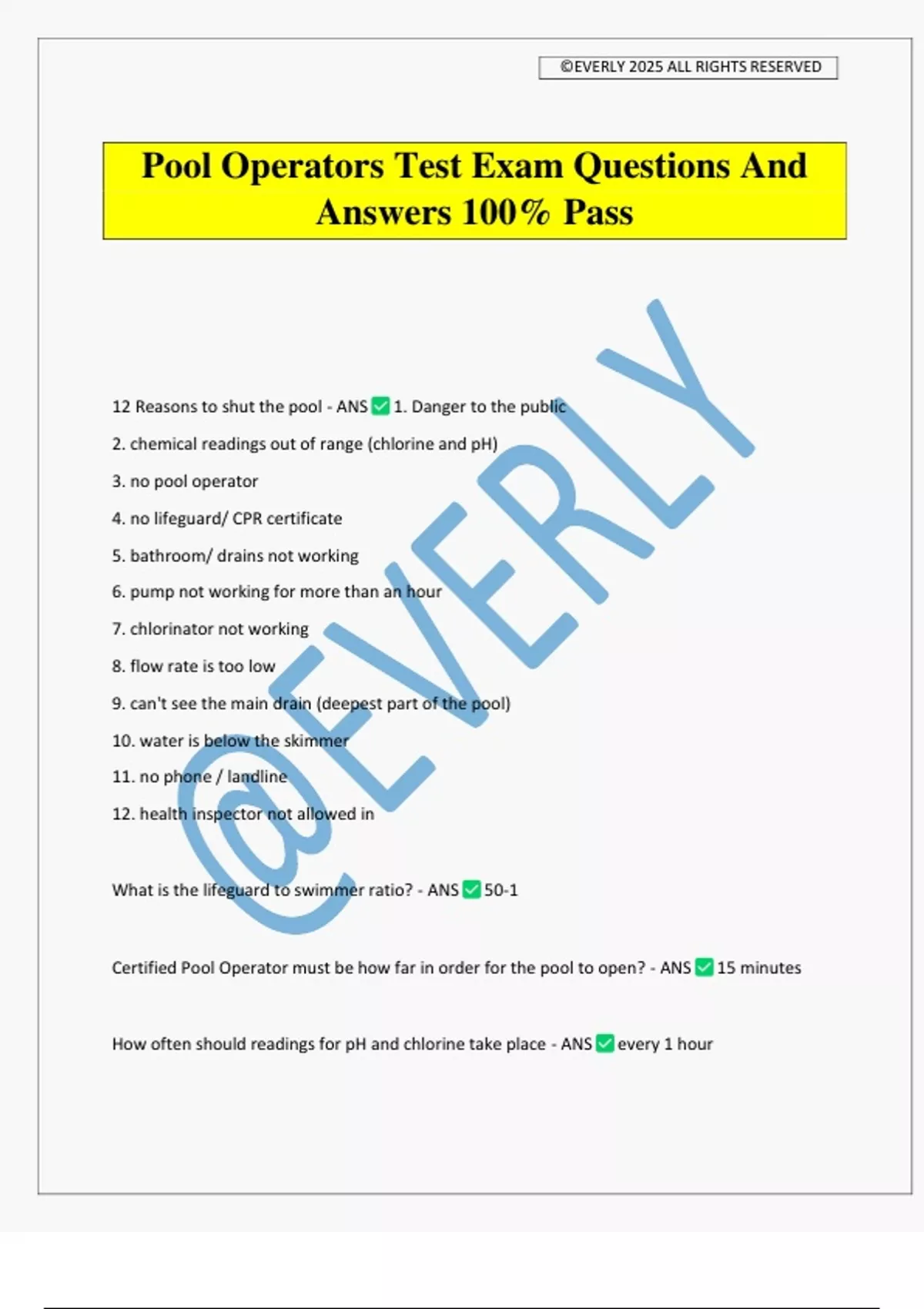 Pool Operators Test Exam Questions And Answers 100% Pass 12 Reasons to shut the pool - ANS 1. Danger to the public 2. chemical readings out of range (chlorine and pH) 3. no pool operator 4. no lifeguard/ CPR certificate 5. bathroom/ drains not working 6. pump not working for more than an hour 7. chlorinator not working 8. flow rate is too low 9. can't see the main drain (deepest part of the pool) 10. water is below the skimmer 11. no phone / landline 12. health inspector not allowed in What is the lifeguard to swimmer ratio? - ANS 50-1 Certified Pool Operator must be how far in order for the pool to open? - ANS 15 minutes How often should readings for pH and chlorine take place - ANS every 1 hour ©EVERLY 2025 ALL RIGHTS RESERVED How long do records need to be held? - ANS 2 years at the pool and 3 years total What is they key to a safe facility? - ANS Prevention Most drownings of victims happen when? - ANS under 4 feet of water under 4 feet tall under 7 years old What does water balance consist of? (5) - ANS pH, Total Alkalinity, Calcium Hardness, Temperature, and Total Dissolved solids (chlorine only disinfects water, it does not maintain sanitary qualities) when does corrosive water happen? - ANS -when the water balance is too low -satisfies its hunger by dissolving it comes in contact with -attacks metals and iron When does scaling water happen? - ANS - when water balance is too high -relieve its overfed condition by releasing precipitates as scale , cloudiness, and residue what is pH? - ANS how basic or how acidic a solution is explain the pH scale. - ANS 0-6: acidic 7: neutral 8-14: basic what is the pH of the human ey