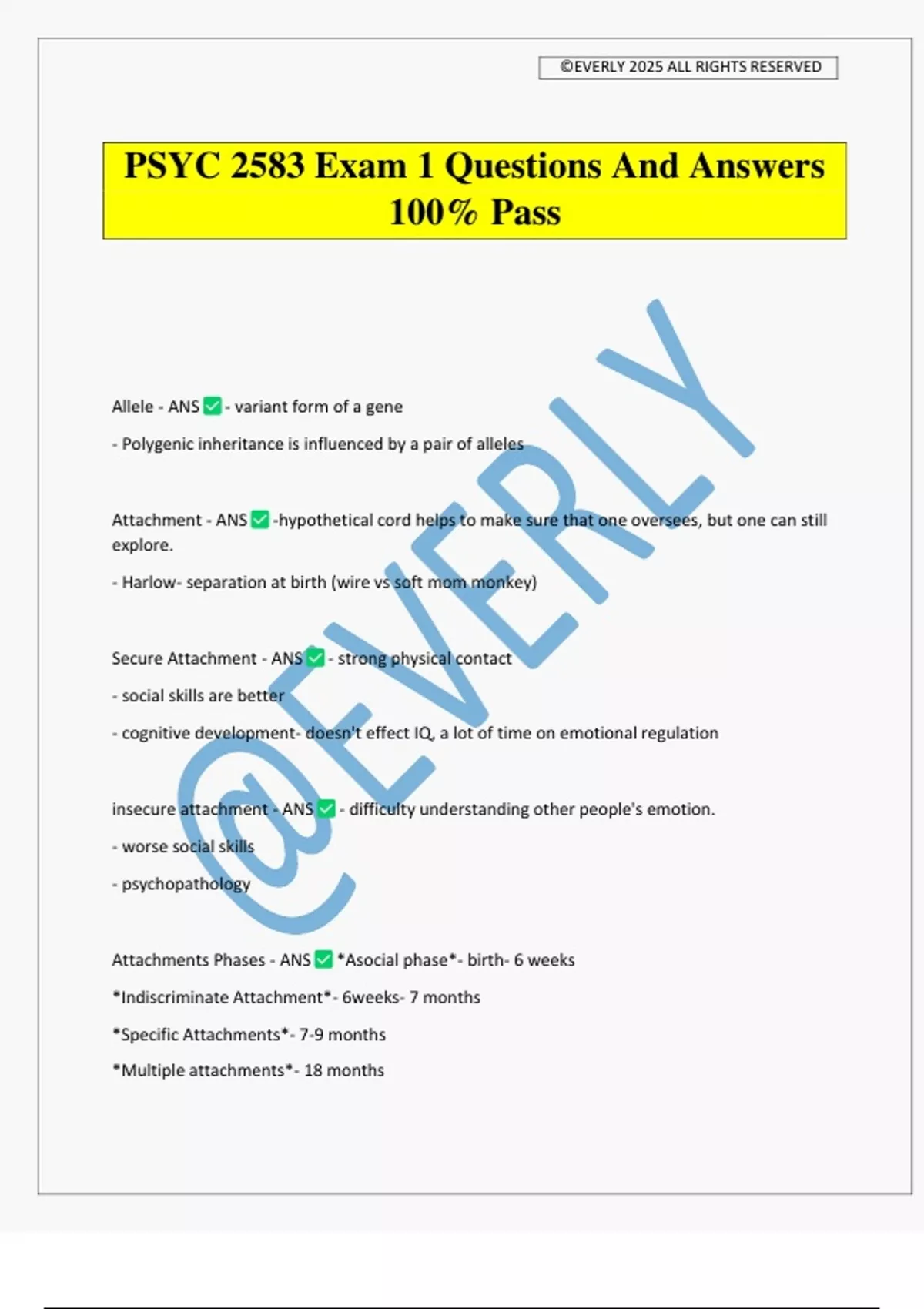PSYC 2583 Exam 1 Questions And Answers 100% Pass Allele - ANS - variant form of a gene - Polygenic inheritance is influenced by a pair of alleles Attachment - ANS -hypothetical cord helps to make sure that one oversees, but one can still explore. - Harlow- separation at birth (wire vs soft mom monkey) Secure Attachment - ANS - strong physical contact - social skills are better - cognitive development- doesn't effect IQ, a lot of time on emotional regulation insecure attachment - ANS - difficulty understanding other people's emotion. - worse social skills - psychopathology Attachments Phases - ANS *Asocial phase*- birth- 6 weeks *Indiscriminate Attachment*- 6weeks- 7 months *Specific Attachments*- 7-9 months *Multiple attachments*- 18 months ©EVERLY 2025 ALL RIGHTS RESERVED Emotional attachment - ANS - Bowlby - mother to infant attachment (smiling, crying etc) - action from one to a response from another Autosomes - ANS first 22 pairs of genes Behaviorism - ANS - Application of animal models of learning to human development (animals are more ethical) - B.F. Skinner- reflects operant conditioning, passively shaped, reinforcers/punishment Broca's Area - ANS left frontal lobe: production of words Chromosomes - ANS 46 per person (23 from mom, 23 from dad) Correlation research - ANS a type of research that focuses on describing the strength of the relation btwn two or more events or characteristics correlation coefficient - ANS A number based on statistical analysis that is used to describe the degree of association btwn two variables Dominant - ANS a gene that overrides the potential influence of another gene Ego - ANS - Part of our personalities that are developed by our civilized world; helps us in day to day life tasks. - Reality Principle - developed by social cont