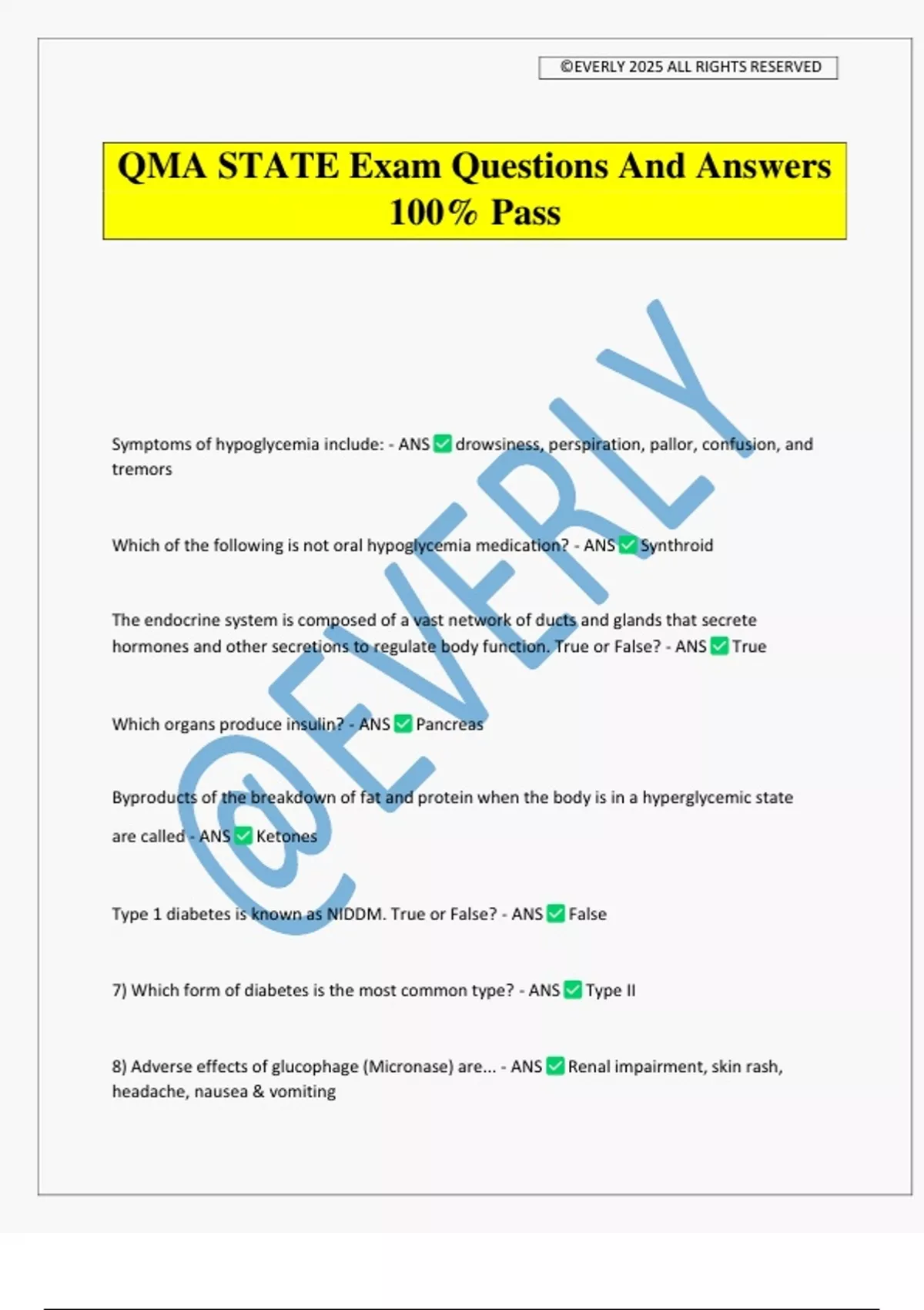 QMA STATE Exam Questions And Answers 100% Pass Symptoms of hypoglycemia include: - ANS drowsiness, perspiration, pallor, confusion, and tremors Which of the following is not oral hypoglycemia medication? - ANS Synthroid The endocrine system is composed of a vast network of ducts and glands that secrete hormones and other secretions to regulate body function. True or False? - ANS True Which organs produce insulin? - ANS Pancreas Byproducts of the breakdown of fat and protein when the body is in a hyperglycemic state are called - ANS Ketones Type 1 diabetes is known as NIDDM. True or False? - ANS False 7) Which form of diabetes is the most common type? - ANS Type II 8) Adverse effects of glucophage (Micronase) are... - ANS Renal impairment, skin rash, headache, nausea & vomiting ©EVERLY 2025 ALL RIGHTS RESERVED Hyperglycemia is a result of too munch insulin and not enough carbohydrates. True or False? - ANS False. Insulin lowers the blood sugar. So that would be hypoglycemia. Mrs. Smith is 87 years old and is hard of hearing, a diabetic has hypothyroidism and constant pain. The doctor may have which medication as part of her regimen to treat her hypothyroidism? - ANS levothyroxine Adverse effects of Levothyroxine are... - ANS Heart palpitations, Tremors, Weight gain, Nervousness, Insomnia Steroid medications can mask the signs of other infections. True or False? - ANS True It is okay to abruptly stop taking steroid medicine. True or False? - ANS False Analgesics: - ANS Drugs that relieve pain. There are two main types: non-narcotic analgesics for mild pain, and narcotic analgesics for severe pain. Antacids: - ANS Drugs that relieve indigestion and heartburn by neutralizing stomach acid. Antianxiety Drugs: - ANS Drugs that suppress anxiety and relax muscles (sometimes called anxiolytics, sedatives, or minor tranquilizers). Antiarrhythmics: - ANS Drugs used to control irregularities of heartbeat. ©EVERLY 2025 ALL RIGHTS RESERVED Antibacterials: - ANS Drugs used to treat infections. Antibiotics: - ANS Drugs made from naturally occurring and synthetic substances that combat bacterial infection. Some antibiotics are effective only against limited types of bacteria. Others, known as broad spectrum antibiotics, are effective against a wide range of bacteria. Anticoagulants and Thrombolytics: - ANS Anticoagulants prevent blood from clotting. Thrombolytics help dissolve and disperse blood clots and may be prescribed for patients with recent arterial or venous thrombosis. Anticonvulsants: - ANS Drugs that prevent epileptic seizures. Antidepressants: - ANS There are three main groups of mood-lifting antidepressants: tricyclics, monoamine oxidase inhibitors, and selective serotonin reuptake inhibitors (SSRIs). Antidiarrheals: - ANS Drugs used for the relief of diarrhea. Two main types of antidiarrheal preparations are simple adsorbent substances and drugs that slow down the contractions of the bowel muscles so that the contents are propelled more slowly. Antiemetics: - ANS Drugs used to treat nausea and vomiting. Antifungals: - ANS Drugs used to treat fungal infections, the most common of which affect the hair, skin, nails, or mucous membranes. Antihistamines: - ANS Drugs used primarily to counteract the effects of histamine, one of the chemicals involved in allergic reactions. Antihypertensives: - ANS Drugs that lower blood pressure. The types of antihypertensives currently marketed include diuretics, beta-blockers, calcium channel blocker, ACE (angiotensin- converting enzyme) inhibito