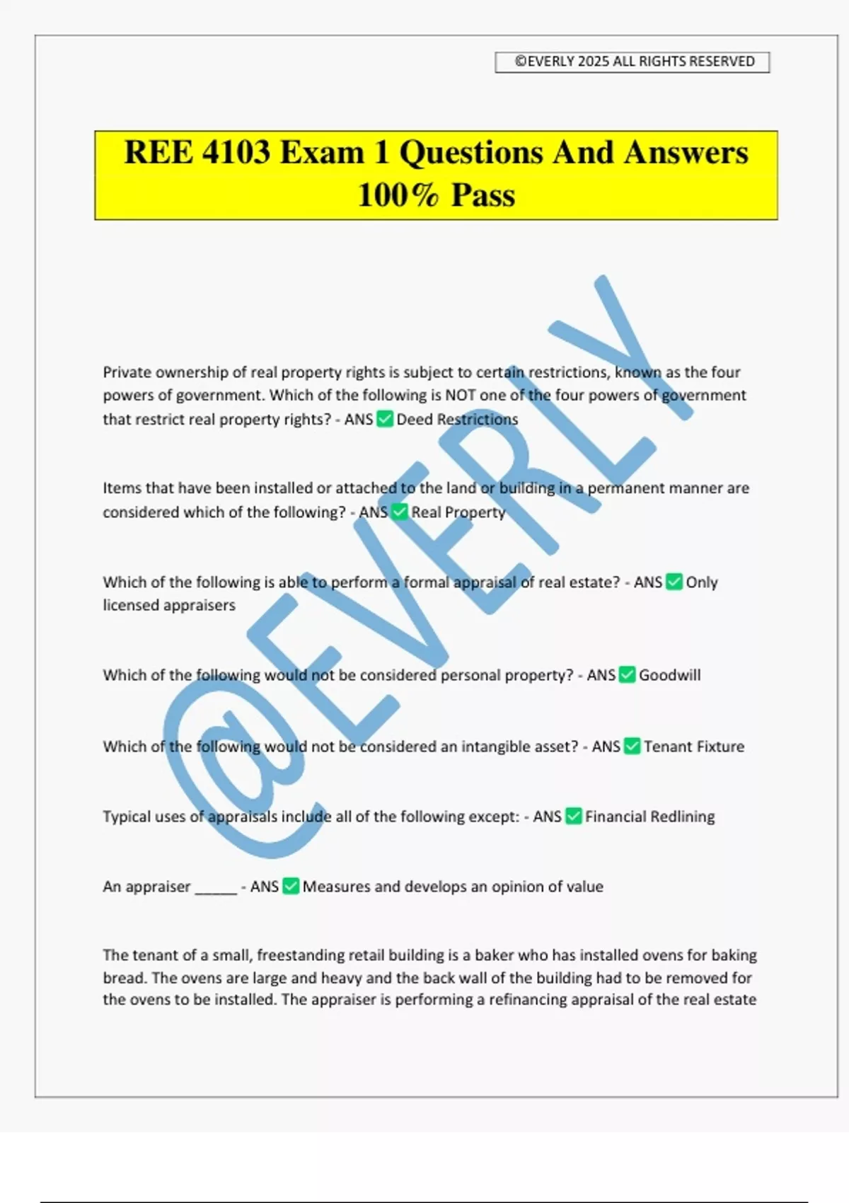 REE 4103 Exam 1 Questions And Answers 100% Pass Private ownership of real property rights is subject to certain restrictions, known as the four powers of government. Which of the following is NOT one of the four powers of government that restrict real property rights? - ANS Deed Restrictions Items that have been installed or attached to the land or building in a permanent manner are considered which of the following? - ANS Real Property Which of the following is able to perform a formal appraisal of real estate? - ANS Only licensed appraisers Which of the following would not be considered personal property? - ANS Goodwill Which of the following would not be considered an intangible asset? - ANS Tenant Fixture Typical uses of appraisals include all of the following except: - ANS Financial Redlining An appraiser _____ - ANS Measures and develops an opinion of value The tenant of a small, freestanding retail building is a baker who has installed ovens for baking bread. The ovens are large and heavy and the back wall of the building had to be removed for the ovens to be installed. The appraiser is performing a refinancing appraisal of the real estate ©EVERLY 2025 ALL RIGHTS RESERVED only. Should the ovens be included in the appraisal? - ANS The appraiser generally would not include the ovens because they are trade fixtures. According to professional standards, appraisal practice includes which of the following types of services? - ANS Appraisal, appraisal review, and appraisal consulting. An appraisal provides ....? - ANS A person's opinion of real property value Which of the following is the best example of using an appraisal in litigation? - ANS Estimating damages created by violations of environmental laws An appraiser is allowed to provide an estimate of what type of value(s)? - ANS Market value, use value, assessed value, fair value, and other types of value identified and defined at the outset of the appraisal assignment. In appraisal, appraisers appraise...? - ANS Real Property Interests The legal definition of real estate includes all of the following except: - ANS Lease benefits An estate in land describes the ___________________ that a person has in the real property. - ANS Degree, nature, or extent of interest Which of the following is the best example of using appraisals in investment counseling? - ANS Developing an opinion of fair value for financial reporting. Which of the following is a market transaction where appraisals are used. - ANS Purchase/Sale Financing Which of the following would not be considered part of the real property? - ANS Furniture ©EVERLY 2025 ALL RIGHTS RESERVED Those assets that are not tangible real property, tangible personal property, or financial assets. Something that is not materal, not corporeal, or not substantially real are _________. - ANS Intangible assets Movable items of property that are not permanently affixed to, or part of, the real estate are considered to be __________. - ANS Personal Property As the nature and extent of land use controls change, so do the nature and extent of private land ownership. Consequently, real estate appraisers must be familiar with the regulations and restrictions that apply to land use in general, but do not need to analyze how these regulations affect a specific property. - ANS False The economic concept of land as a sourse of wealth and an object of value is central to appraisal theory. - ANS True In economics, land is regarded as one of the four agents of production, along with labor, capital, and entrepreneurial coordination. - ANS True Legal matters of particular concern to appraisers include all of the following except: - ANS Property Size The utility of land and the highest and best use to which land can be put are significantly affected by the physical and locational characteristics of the land and other related considerations, broadly referred to as geography. - ANS True The concepts of land are - ANS Legal, geographic and environmental, economic, and social. All of the following ar