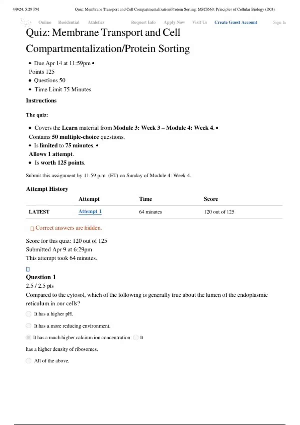 ,4/9/24, 5:29 PM Quiz: Membrane Transport and Cell Compartmentalization/Protein Sorting: MSCI660: Principles of Cellular Biology (D03)