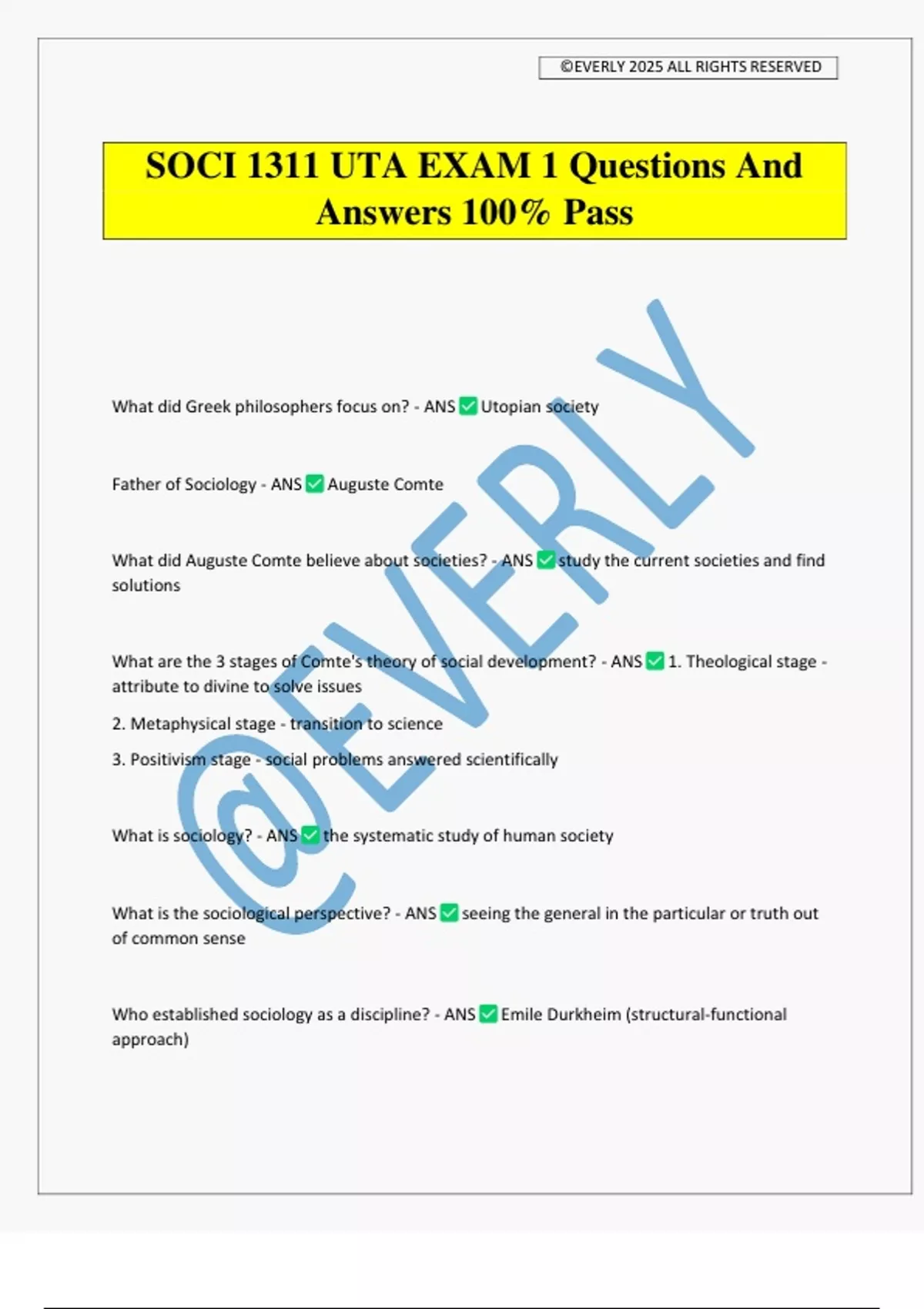 SOCI 1311 UTA EXAM 1 Questions And Answers 100% Pass What did Greek philosophers focus on? - ANS Utopian society Father of Sociology - ANS Auguste Comte What did Auguste Comte believe about societies? - ANS study the current societies and find solutions What are the 3 stages of Comte's theory of social development? - ANS 1. Theological stage - attribute to divine to solve issues 2. Metaphysical stage - transition to science 3. Positivism stage - social problems answered scientifically What is sociology? - ANS the systematic study of human society What is the sociological perspective? - ANS seeing the general in the particular or truth out of common sense Who established sociology as a discipline? - ANS Emile Durkheim (structural-functional approach) ©EVERLY 2025 ALL RIGHTS RESERVED What are the 3 major theoretical approaches? - ANS 1. Structural functional 2. Social conflict 3. Symbolic interaction What is the structural functional approach? - ANS sees society as an organism - complex parts that work together List the sociologists who believe in the structural functional approach - ANS Emile Durkheim August Comte Herbert Spencer Who compared society to