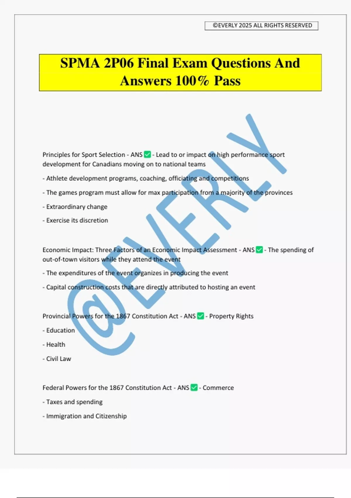 SPMA 2P06 Final Exam Questions And Answers 100% Pass Principles for Sport Selection - ANS - Lead to or impact on high performance sport development for Canadians moving on to national teams - Athlete development programs, coaching, officiating and competitions - The games program must allow for max participation from a majority of the provinces - Extraordinary change - Exercise its discretion Economic Impact: Three Factors of an Economic Impact Assessment - ANS - The spending of out-of-town visitors while they attend the event - The expenditures of the event organizes in producing the event - Capital construction costs that are directly attributed to hosting an event Provincial Powers for the 1867 Constitution Act - ANS - Property Rights - Education - Health - Civil Law Federal Powers for the 1867 Constitution Act - ANS - Commerce - Taxes and spending - Immigration and Citizenship ©EVERLY 2025 ALL RIGHTS RESERVED - Military - Criminal Law Game ON - ANS - Legacy of the PanAm Games - Facilities (Tim Hortons Field) - Policy Legacies (First Sport Plan, Revised funding programs) Recognition of Sport Policy for Provincial and Multi-Sport Orgs require: - ANS - Meet the definition of sport - Be recognized by NSO - Be an NPO - Elected Board of Directors - Annual Financial Audit - Have a budget Ontario Amateur Sport Fund (SC, P, D, E, OGP) - ANS System Capacity - activities that enable orgs to develop and enhance their operational governance Participation - ensures athletes are better able to participate in safe sport - Active Start, Fundamentals, Active for Life Development - ensures athletes receive the right support as their skills develop - Learn to Train, Train to T