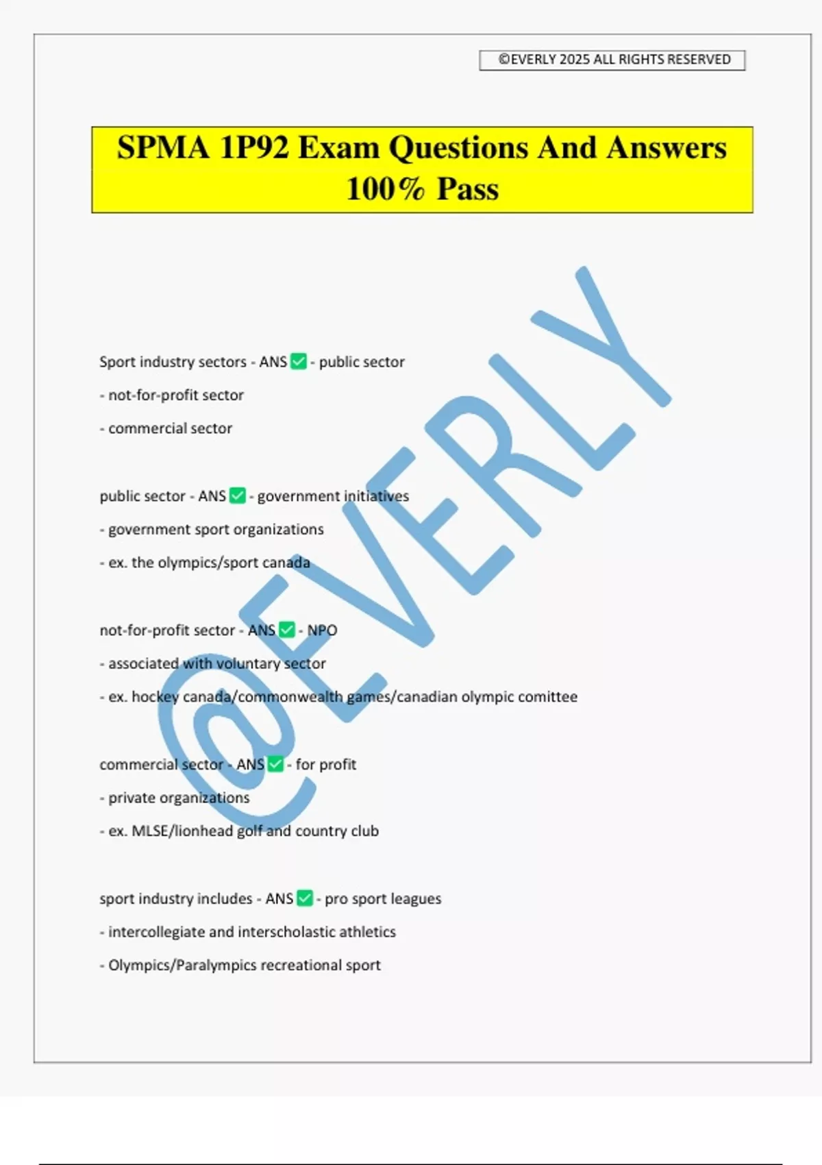 SPMA 1P92 Exam Questions And Answers 100% Pass Sport industry sectors - ANS - public sector - not-for-profit sector - commercial sector public sector - ANS - government initiatives - government sport organizations - ex. the olympics/sport canada not-for-profit sector - ANS - NPO - associated with voluntary sector - ex. hockey canada/commonwealth games/canadian olympic comittee commercial sector - ANS - for profit - private organizations - ex. MLSE/lionhead golf and country club sport industry includes - ANS - pro sport leagues - intercollegiate and interscholastic athletics - Olympics/Paralympics recreational sport ©EVERLY 2025 ALL RIGHTS RESERVED - facility management - event management - sport for disabled people/ elderly people - health and fitness - sport club management - sport marketing - legal aspects of sport defining sport organization - ANS a group of people who are working together to accomplish goals related to providing some sport related product and or service why is sport different from other industries - ANS - an industry that drives upon peoples passions - perishable product - service orientation attributes of a sport organization - ANS - identity ( name, corporate identity) - program of activity (goals, mission, operations) - membership (norms, rules) - clear boundaries (verifiable) - permanency (in spite of changes) - division of labour (determine tasks) - hierarchy of authority (who reports to who) - formal rules and procedures (bylaws and procedures) sole proprietorship - ANS - one individual owns and operates - incurs all profits and losses