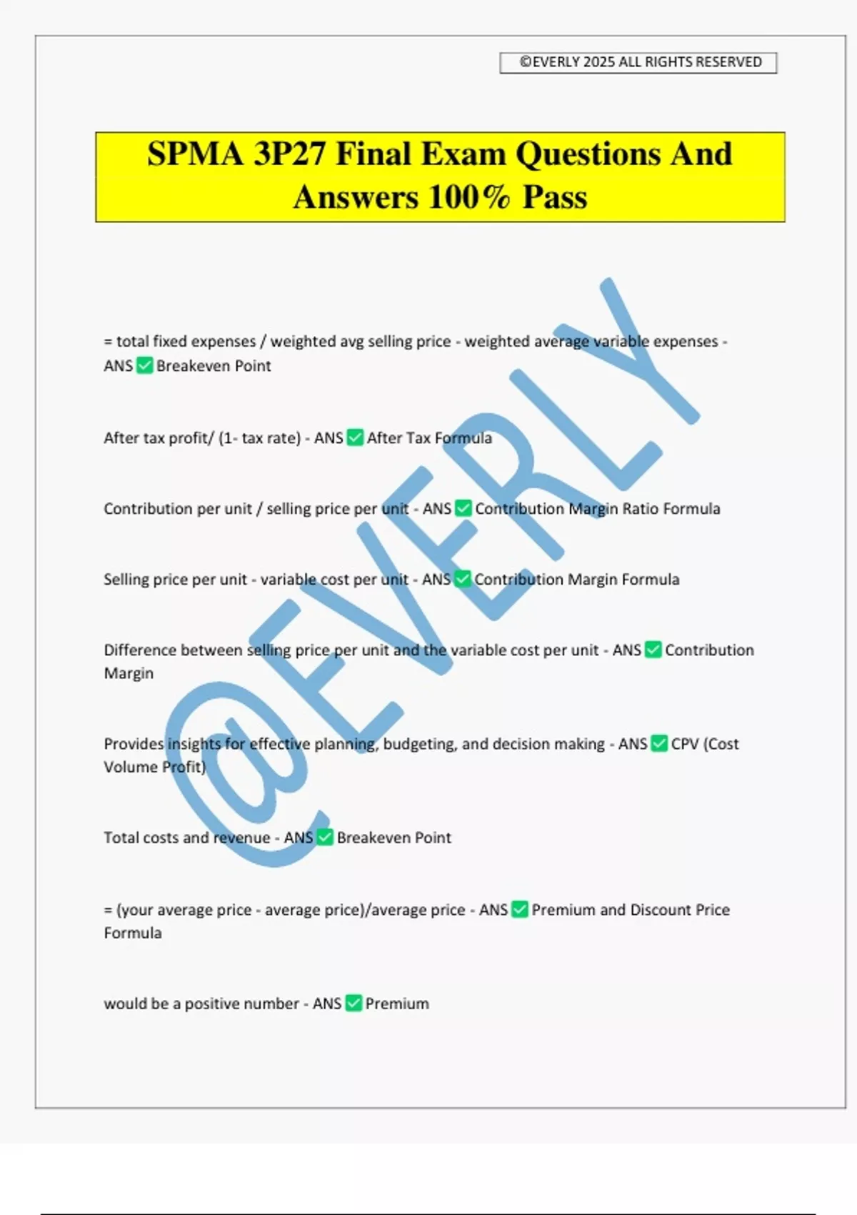 SPMA 3P27 Final Exam Questions And Answers 100% Pass = total fixed expenses / weighted avg selling price - weighted average variable expenses - ANS Breakeven Point After tax profit/ (1- tax rate) - ANS After Tax Formula Contribution per unit / selling price per unit - ANS Contribution Margin Ratio Formula Selling price per unit - variable cost per unit - ANS Contribution Margin Formula Difference between selling price per unit and the variable cost per unit - ANS Contribution Margin Provides insights for effective planning, budgeting, and decision making - ANS CPV (Cost Volume Profit) Total costs and revenue - ANS Breakeven Point = (your average price - average price)/average price - ANS Premium and Discount Price Formula would be a positive number - ANS Premium ©EVERLY 2025 ALL RIGHTS RESERVED would be a negative number - ANS DIscount What is the minimum price you would charge as a company with $15,000 in variable costs, $18,000 in Fixed Costs, and a desire for $8,000 in contingencies (i.e. owner salary), assuming you produce 800 units per year? - ANS $51.25 What is the MINIMUM price for a sport hat company to charge when producing 1500 units per month with $20,000 Fixed Costs and $3 per unit variable costs? - ANS $16.3 When managers are required to justify all budgeting expenditures - ANS Zero Based Budget Cost of activities needed to produce goods and services - ANS Activity Based budgeting What are the goals of Red Ocean? - ANS Beat competition What are the goals of Blue Ocean? - ANS Make competition relevant Blue Ocean - ANS uncontested market space Red Ocean - ANS Competing in an existing market Examples of Blue Ocean - ANS eBay Examples of Red Ocean - ANS Cirque Du Soleil, Marvel How do you create a blue ocean