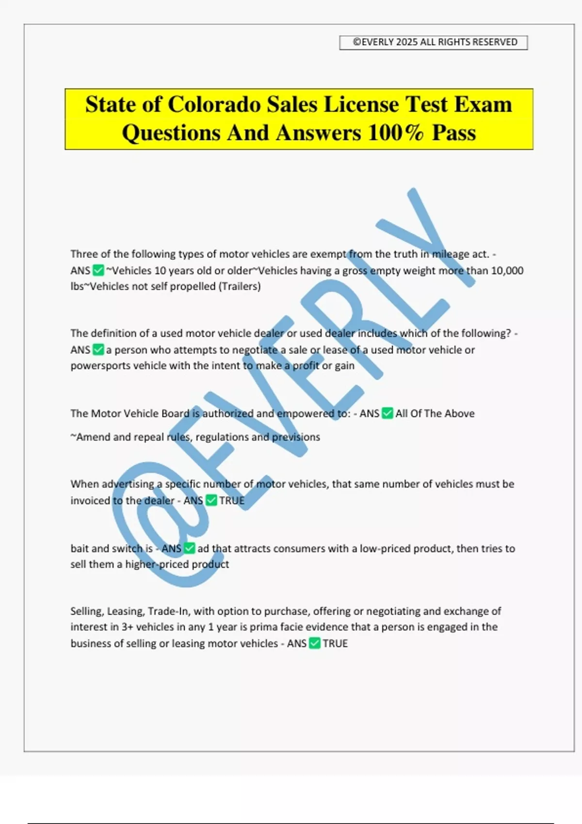 State of Colorado Sales License Test Exam Questions And Answers 100% Pass Three of the following types of motor vehicles are exempt from the truth in mileage act. - ANS ~Vehicles 10 years old or older~Vehicles having a gross empty weight more than 10,000 lbs~Vehicles not self propelled (Trailers) The definition of a used motor vehicle dealer or used dealer includes which of the following? - ANS a person who attempts to negotiate a sale or lease of a used motor vehicle or powersports vehicle with the intent to make a profit or gain The Motor Vehicle Board is authorized and empowered to: - ANS All Of The Above ~Amend and repeal rules, regulations and previsions When advertising a specific number of motor vehicles, that same number of vehicles must be invoiced to the dealer - ANS TRUE bait and switch is - ANS ad that attracts consumers with a low-priced product, then tries to sell them a higher-priced product Selling, Leasing, Trade-In, with option to purchase, offering or negotiating and exchange of interest in 3+ vehicles in any 1 year is prima facie evidence that a person is engaged in the business of selling or leasing motor vehicles - ANS TRUE ©EVERLY 2025 ALL RIGHTS RESERVED By obtaining an off-premise permit, dealers may sell motor vehicles at another location on Sunday - ANS FALSE - NO Sale of vehicle should be done on Sundays Which of the following statements is true regarding dealer demo plates? - ANS a demo drive cannot exceed 7 days Colorado Lemon Law includes: - ANS defects that substantially impair the market value of the vehicle Motor vehicle insurance is required: - ANS for all registered vehicles intended for use on colorado roads Which is true regarding in-transit plates? - ANS in-transit plates may be used to transport vehicles from point of purchase to point of storage or from point of storage to point of sale Licensed dealers may sell which of the following on Sundays? - ANS The selling of boat trailers and snowmobile are exempt Which of the following steps are required to properly and legally repossess a motor vehicle? - ANS effect a lien creating a security interest, Allow the required payment to default (become at least 10 days late), send or hand deliver a "right to cure" letter to the debtor and allow the debtor 20 days to cure An advertisement may include - ANS licensed name with the word DEALER which of the following is a used vehicle? - ANS any vehicle that has been previously bought a demo vehicle with 1500 miles Which of the following a