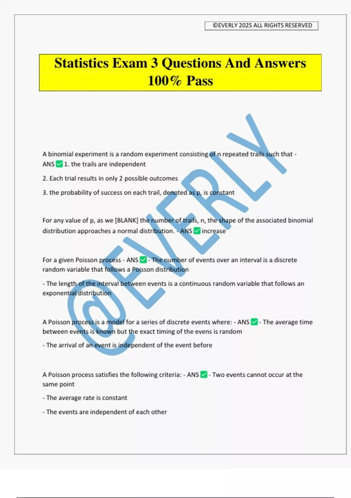 Statistics Exam 3 Questions And Answers 100% Pass A binomial experiment is a random experiment consisting of n repeated trails such that - ANS 1. the trails are independent 2. Each trial results in only 2 possible outcomes 3. the probability of success on each trail, denoted as p, is constant For any value of p, as we [BLANK] the number of trails, n, the shape of the associated binomial distribution approaches a normal distribution. - ANS increase For a given Poisson process - ANS - The number of events over an interval is a discrete random variable that follows a Poisson distribution - The length of the interval between events is a continuous random variable that follows an exponential distribution A Poisson process is a model for a series of discrete events where: - ANS - The average time between events is known but the exact timing of the evens is random - The arrival of an event is independent of the event before A Poisson process satisfies the following criteria: - ANS - Two events cannot occur at the same point - The average rate is constant - The events are independent of each othe