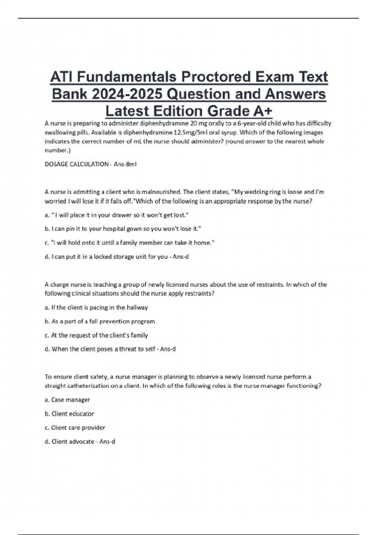 A nurse is preparing to administer diphenhydramine 20 mg orally to a 6-year-old child who has difficulty swallowing pills. Available is diphenhydramine 12.5mg/5ml oral syrup. Which of the following images indicates the correct number of mL the nurse should administer? (round answer to the nearest whole number.) DOSAGE CALCULATION - Ans-8ml A nurse is admitting a client who is malnourished. The client states, "My wedding ring is loose and I'm worried I will lose it if it falls off."Which of the following is an appropriate response by the nurse? a. " I will place it in your drawer so it won't get lost." b. I can pin it to your hospital gown so you won't lose it." c. "I will hold onto it until a family member can take it home." d. I can put it in a locked storage unit for you - Ans-d A charge nurse is teaching a group of newly licensed nurses about the use of restraints. In which of the following clinical situations should the nurse apply restraints?.....